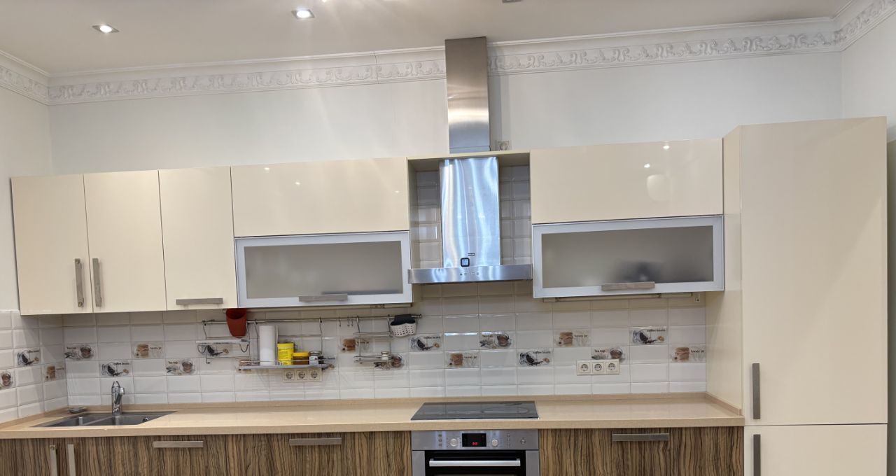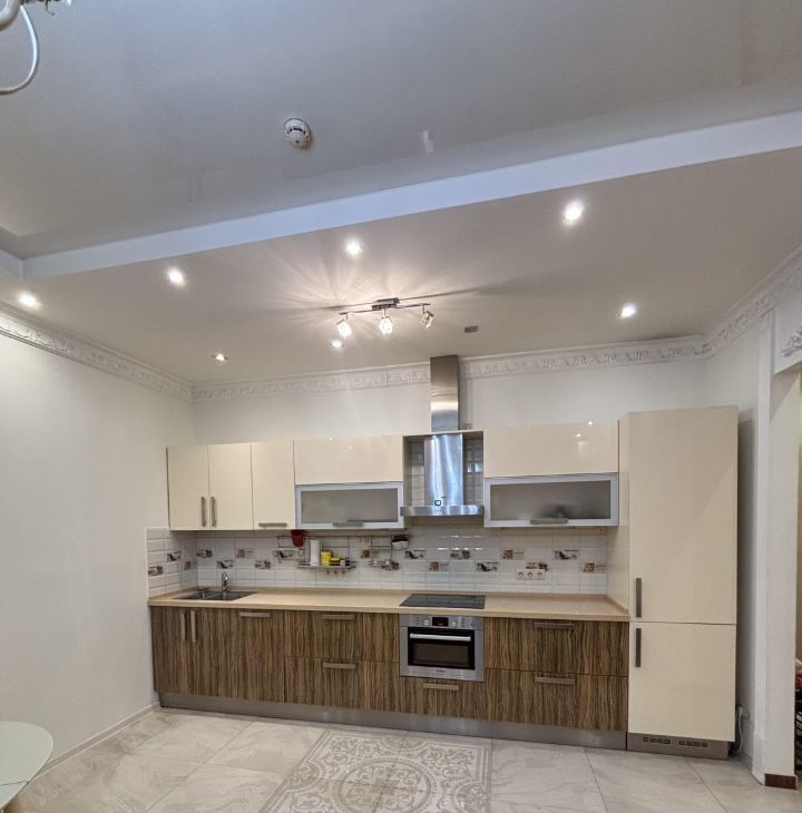 — кухня-гостиная с современным гарнитуром и встроенной техникой