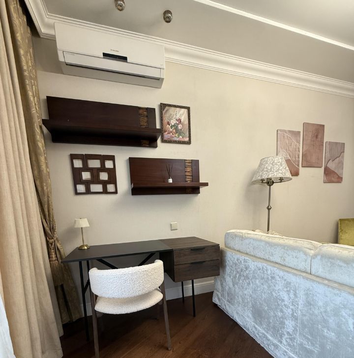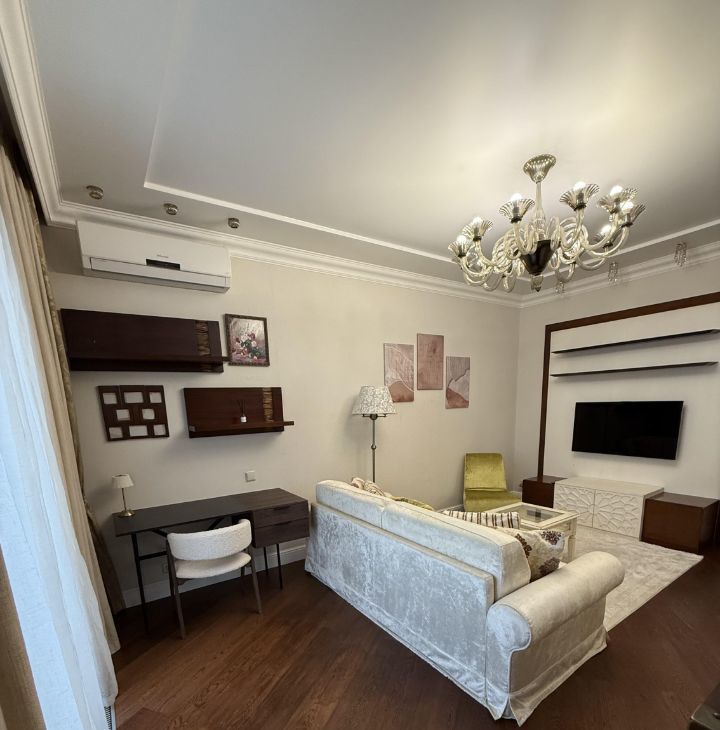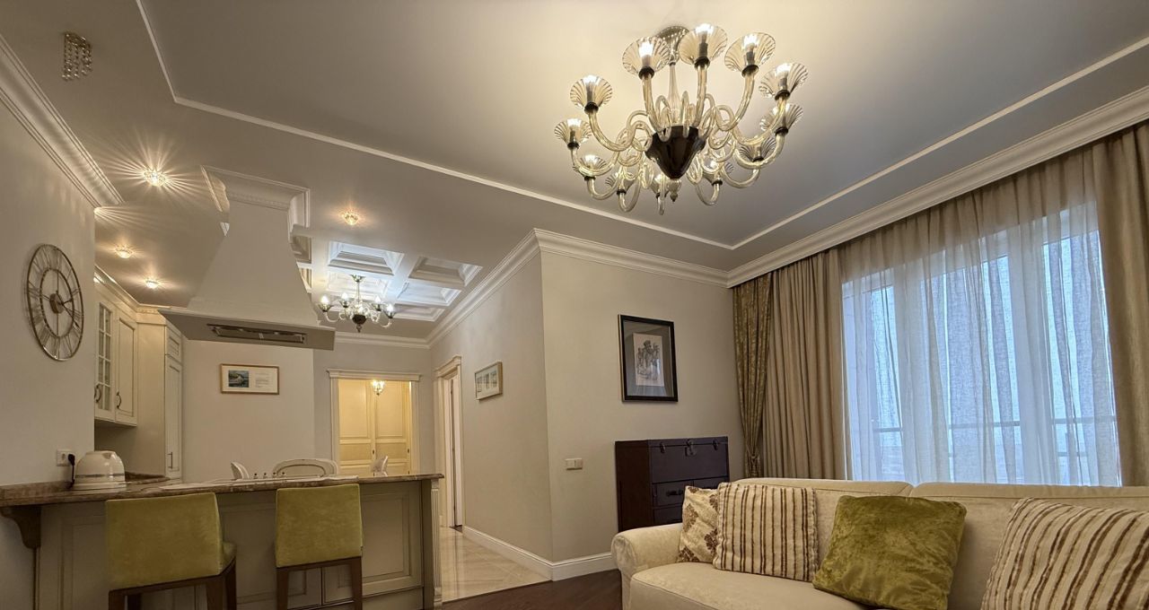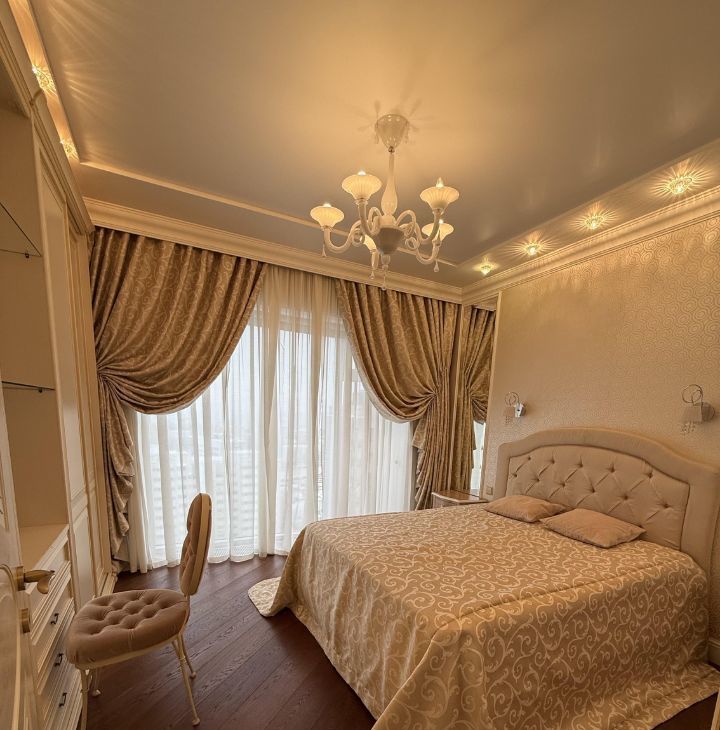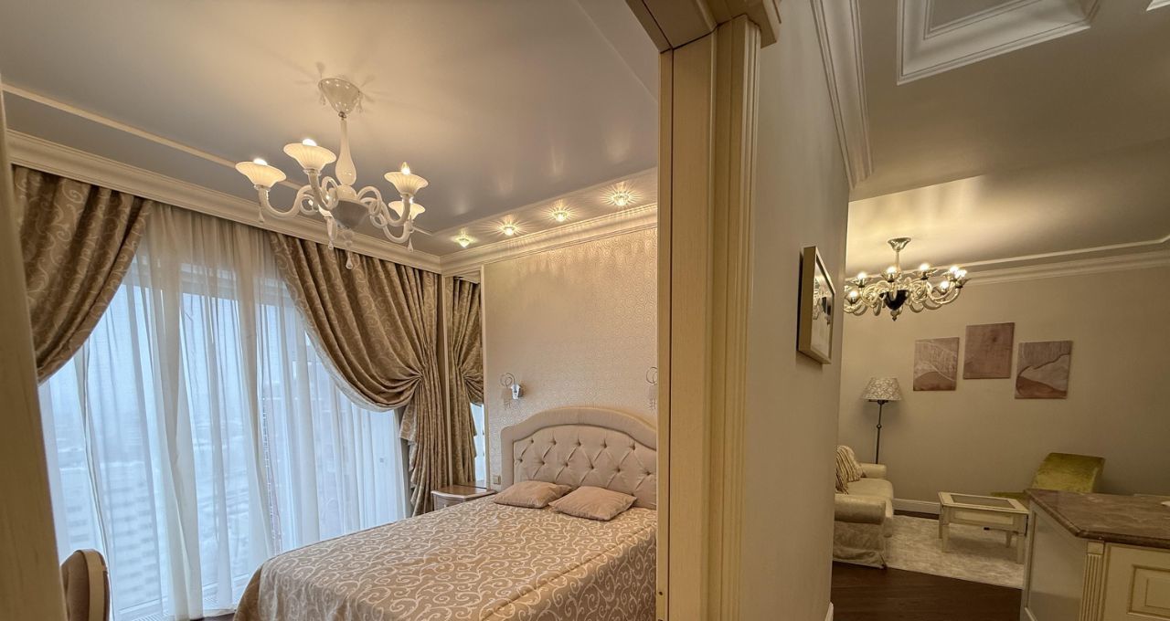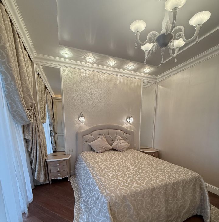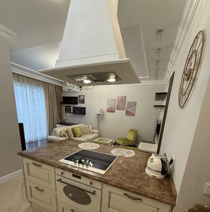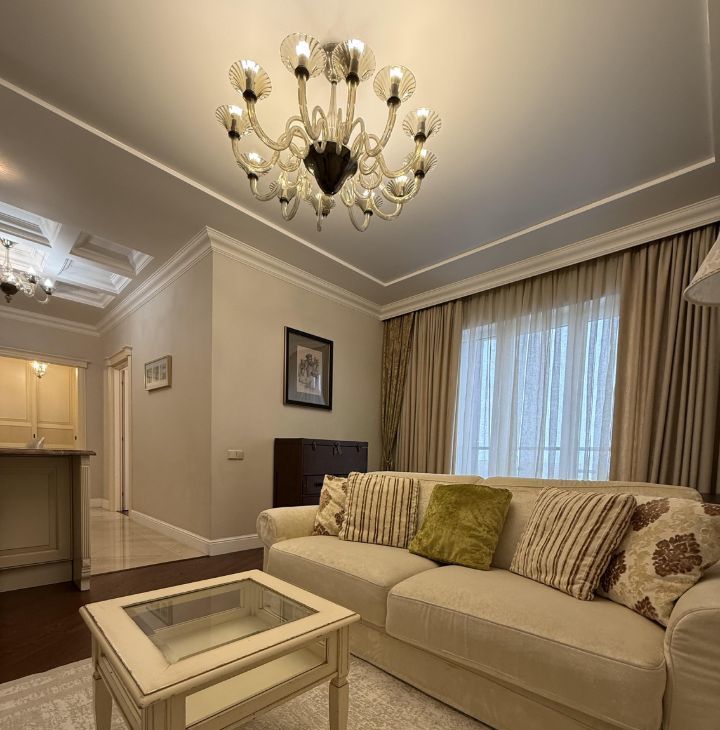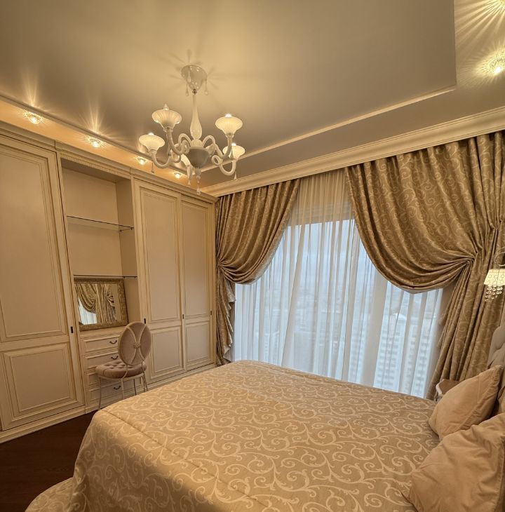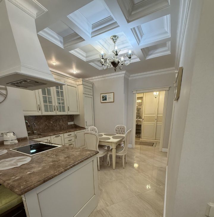 В квартире: 2 изолированных комнаты (мастер-спальня, детская комната: комфортное размещение 2 детей) и кухня-гостиная (в гостиной раскладывающийся диван с ортопедическим матрацем), просторный санузел (туалет, 2 раковины, ванна с тропическим душем, мебель). Квартира отделана качественными итальянскими материалами (плитка, обои, паркет), итальянская мебель во всех комнатах, кухня Scavolini (вся мебель была сделана на заказ), дизайнерские люстры и светильники, качественный итальянский текстиль на окнах.