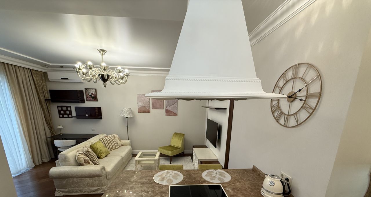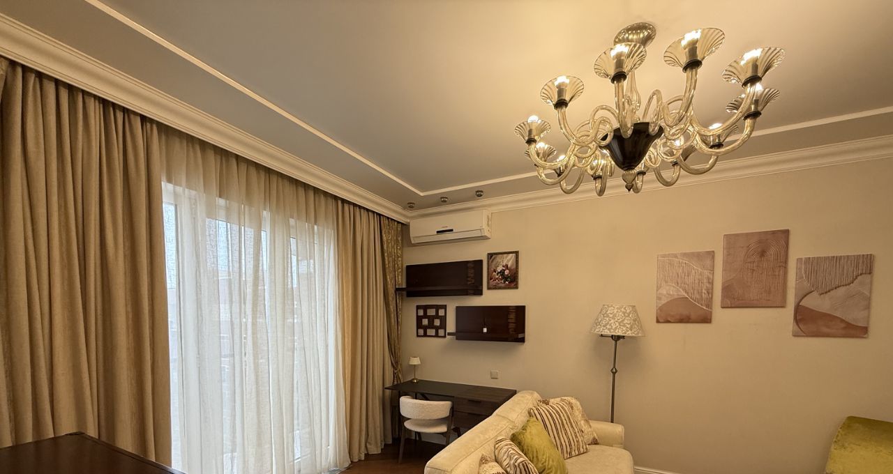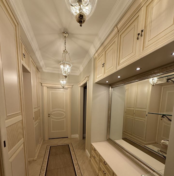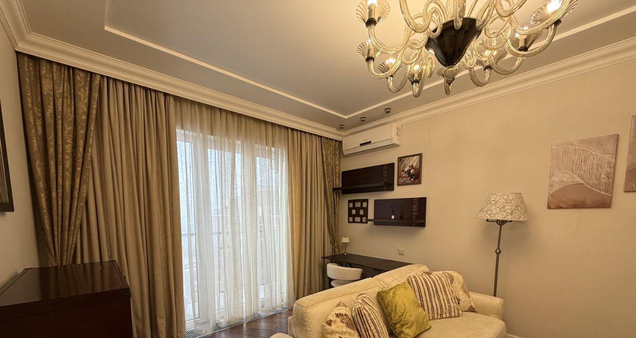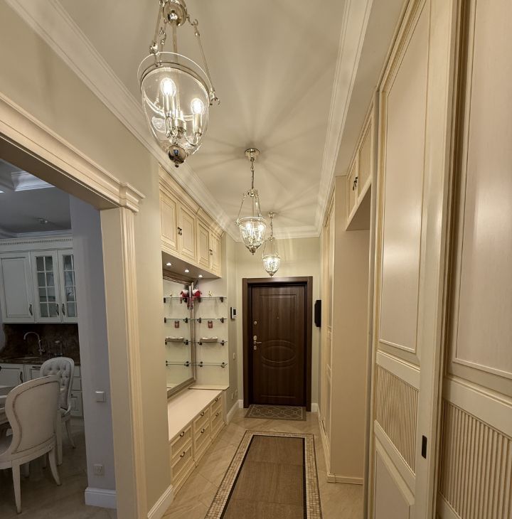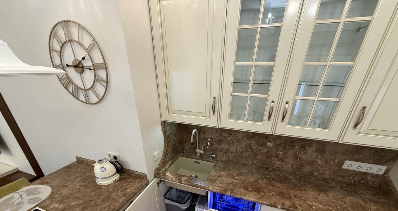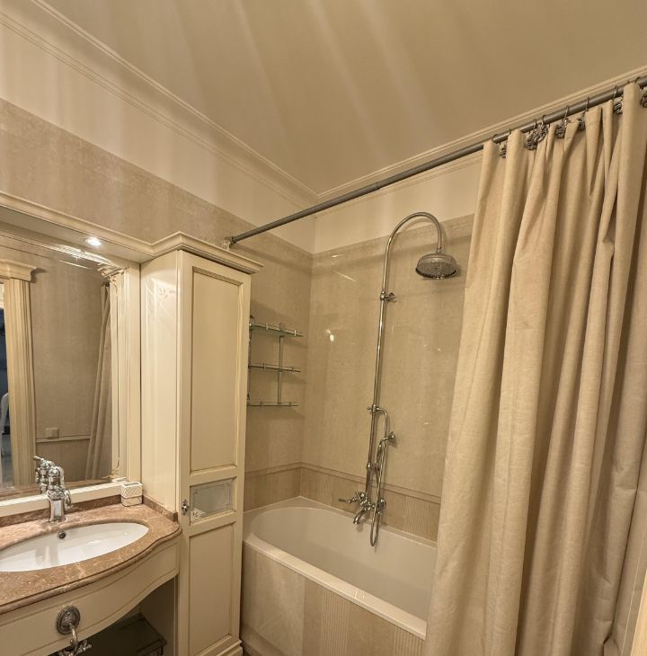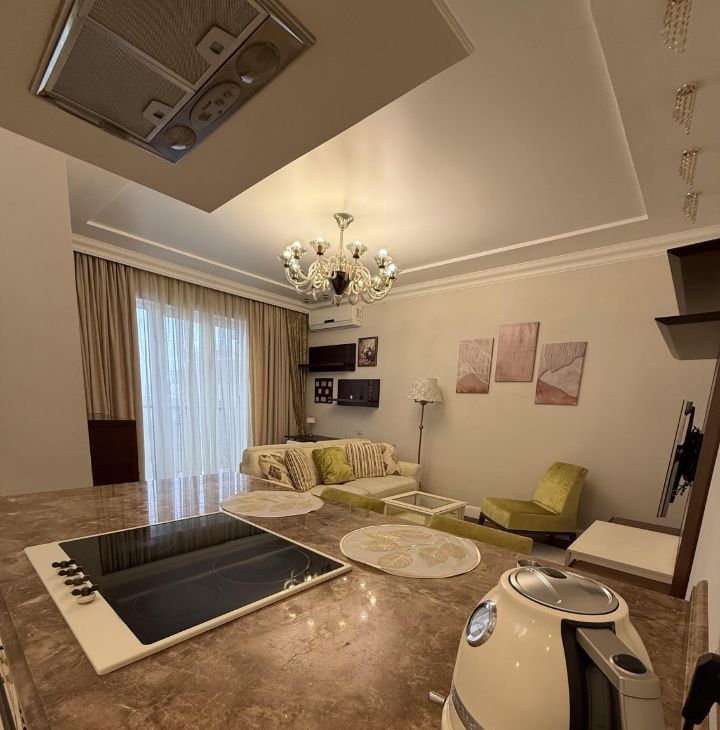 В квартире: 2 изолированных комнаты (мастер-спальня, детская комната: комфортное размещение 2 детей) и кухня-гостиная (в гостиной раскладывающийся диван с ортопедическим матрацем), просторный санузел (туалет, 2 раковины, ванна с тропическим душем, мебель). Квартира отделана качественными итальянскими материалами (плитка, обои, паркет), итальянская мебель во всех комнатах, кухня Scavolini (вся мебель была сделана на заказ), дизайнерские люстры и светильники, качественный итальянский текстиль на окнах.