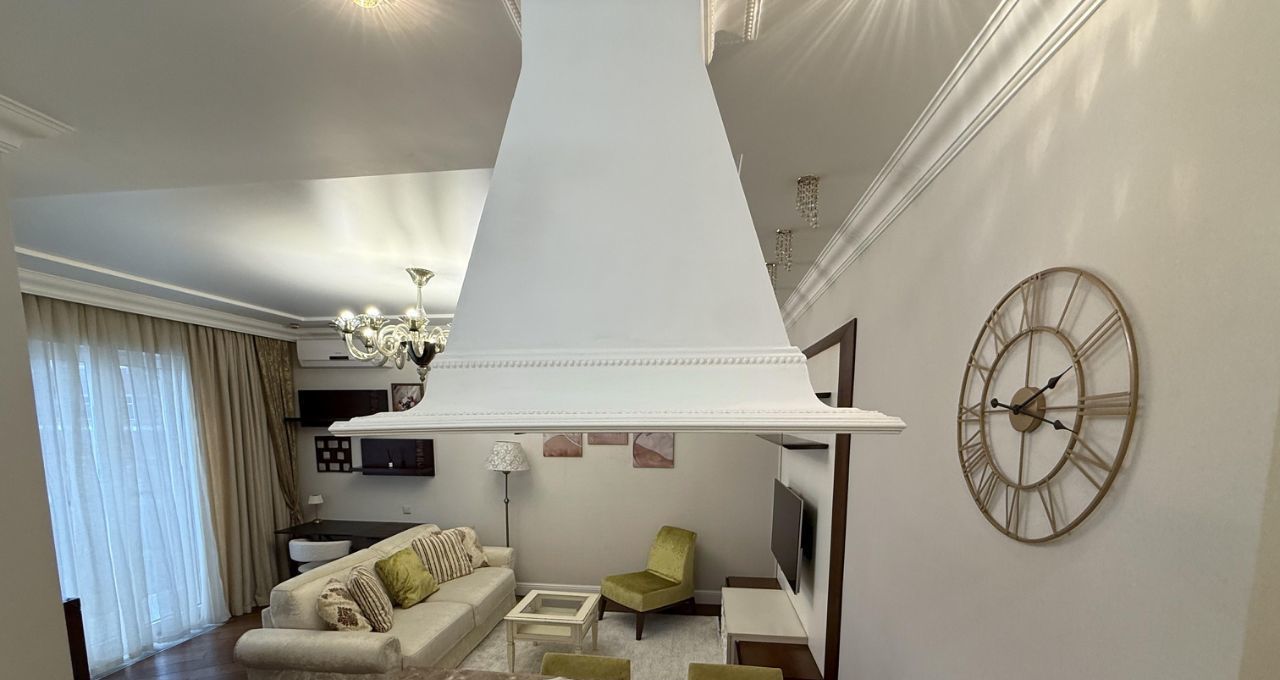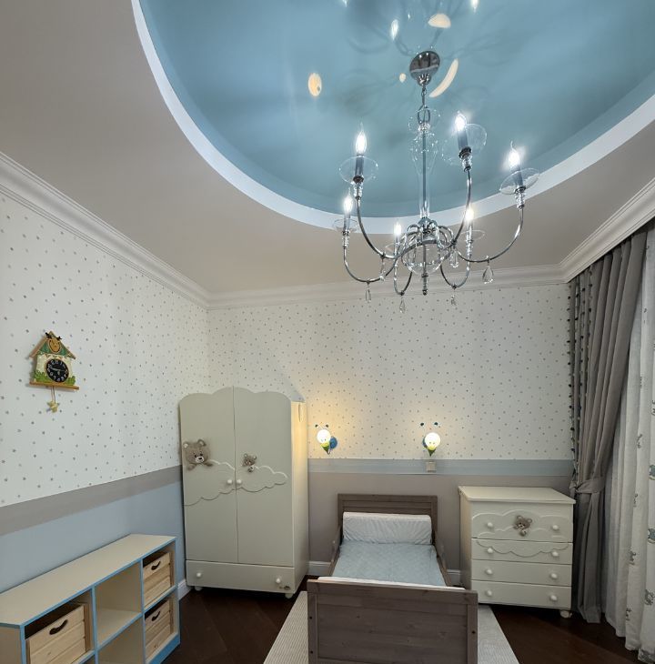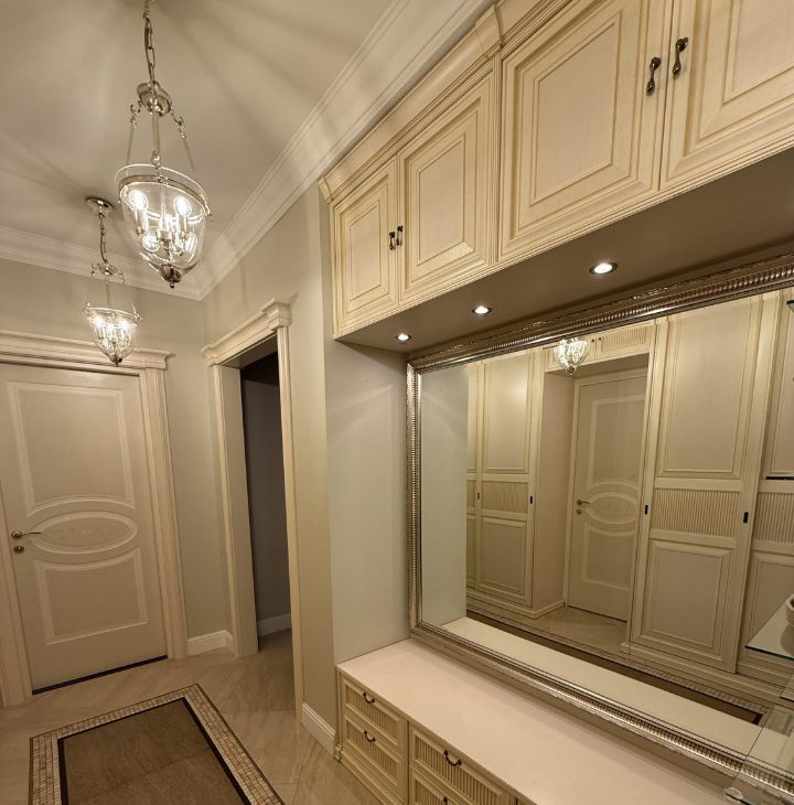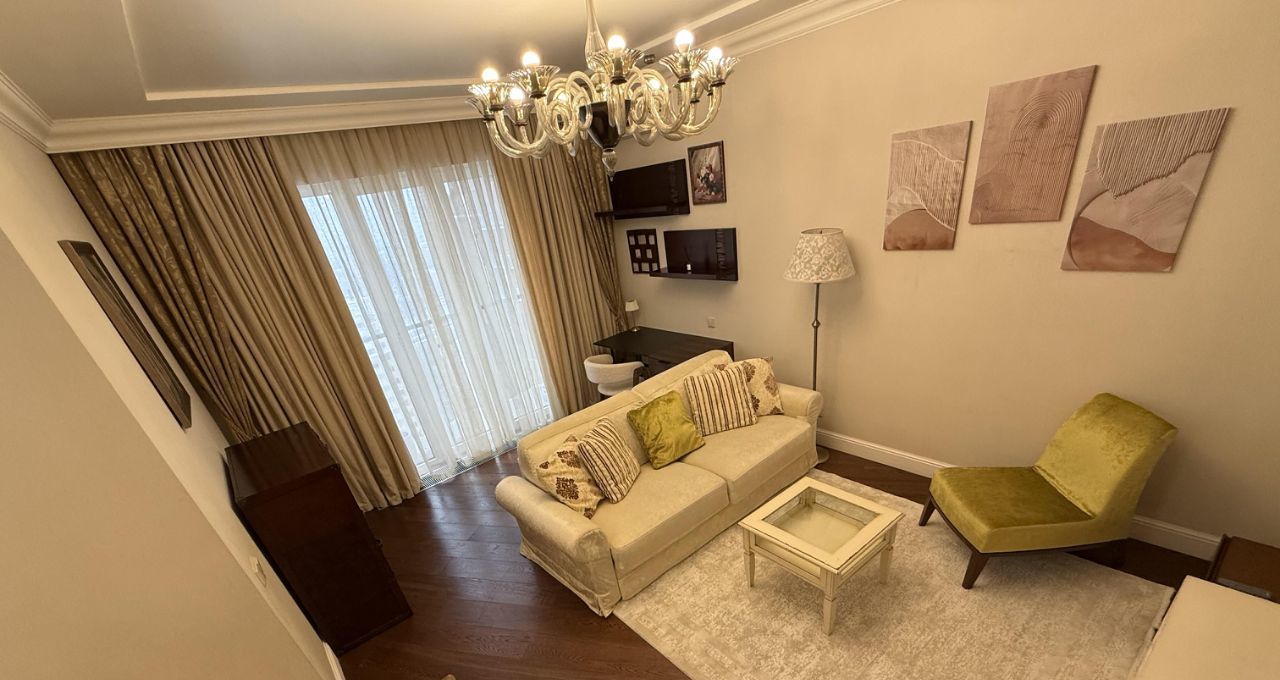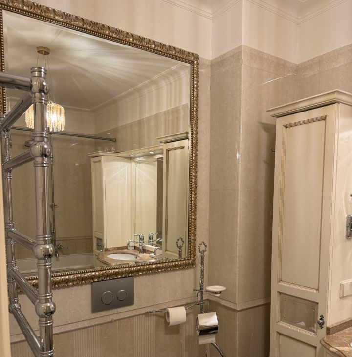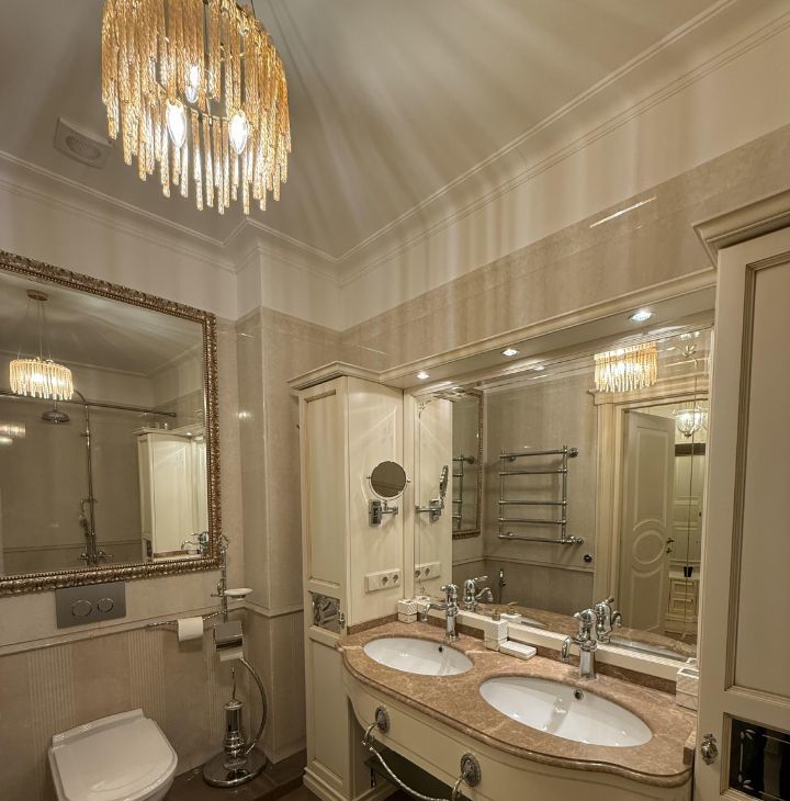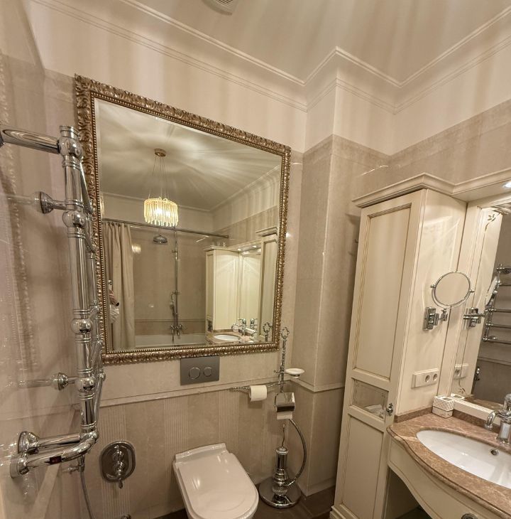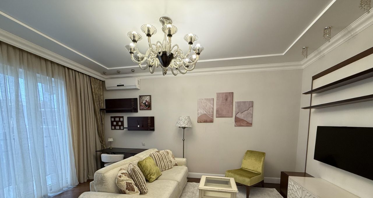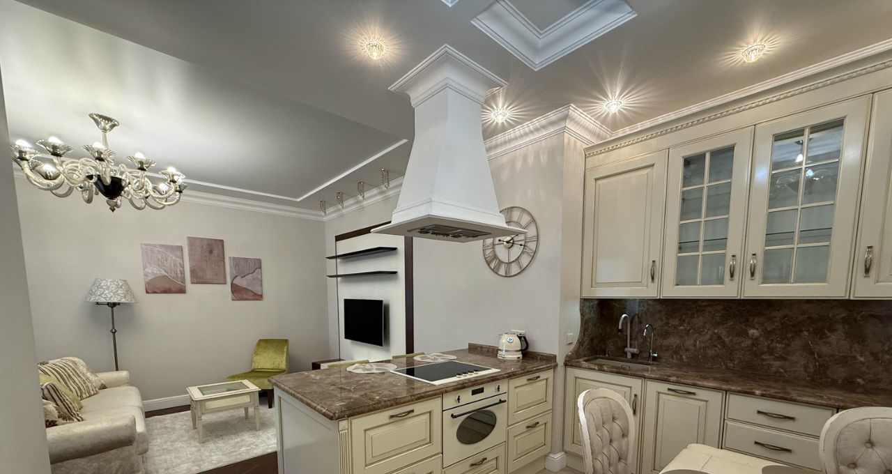 В квартире: 2 изолированных комнаты (мастер-спальня, детская комната: комфортное размещение 2 детей) и кухня-гостиная (в гостиной раскладывающийся диван с ортопедическим матрацем), просторный санузел (туалет, 2 раковины, ванна с тропическим душем, мебель). Квартира отделана качественными итальянскими материалами (плитка, обои, паркет), итальянская мебель во всех комнатах, кухня Scavolini (вся мебель была сделана на заказ), дизайнерские люстры и светильники, качественный итальянский текстиль на окнах.