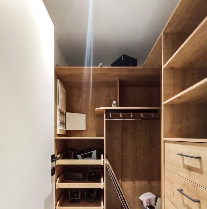 В комнате и кухонной зоне уложен ламинат, в санузле — плитка, оборудована вместительная гардеробная, два санузла. Есть всё необходимое для комфортного проживания: