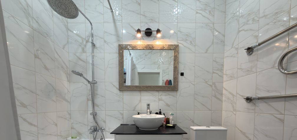 Квартира полностью меблирована: есть мебель как на кухне, так и в комнате. Из техники в вашем распоряжении кондиционер, холодильник, посудомоечная и стиральная машины, а также телевизор. Совмещённый санузел оборудован ванной. Для удобства жильцов проведён интернет, поэтому можно сразу подключиться к сети.