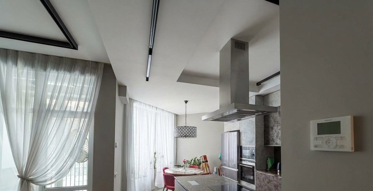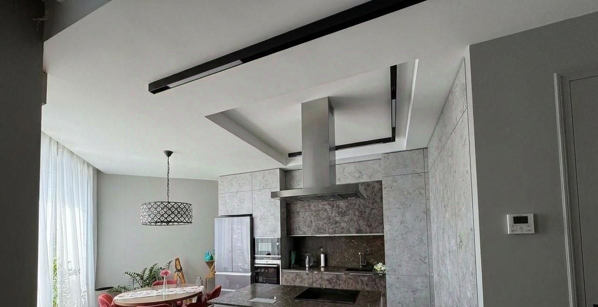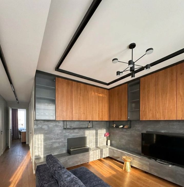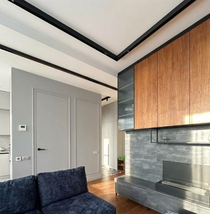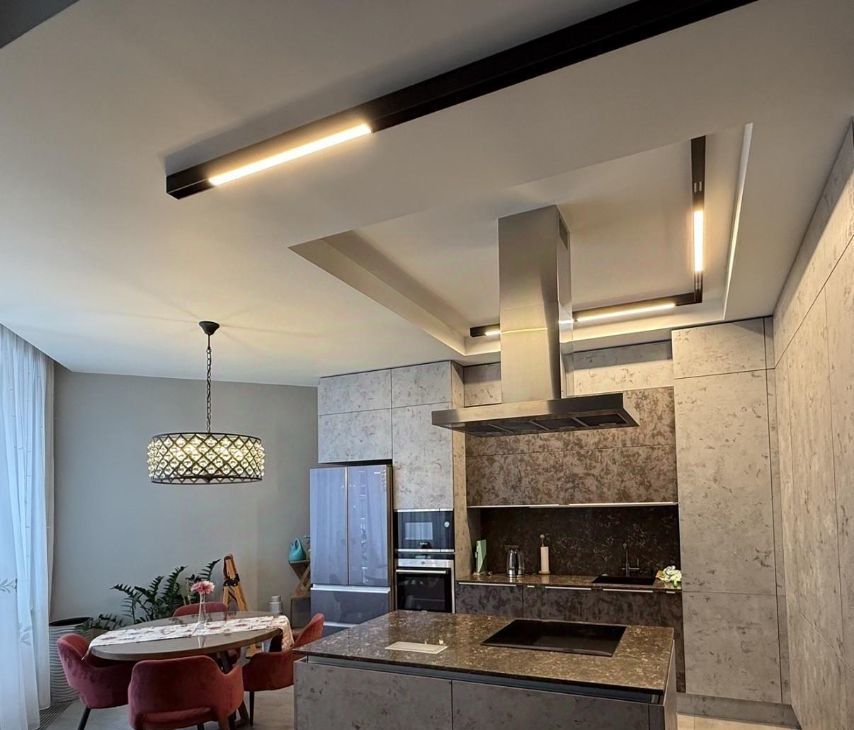 - Открытое пространство гостиной-столовой: кухня-гостиная представлена рабочей зоной (холодильник, варочная панель, вытяжка, посудомоечная машина, духовой шкаф, микроволновая печь), обеденной зоной и зоной отдыха с большим диваном, телевизором и электрокамином.