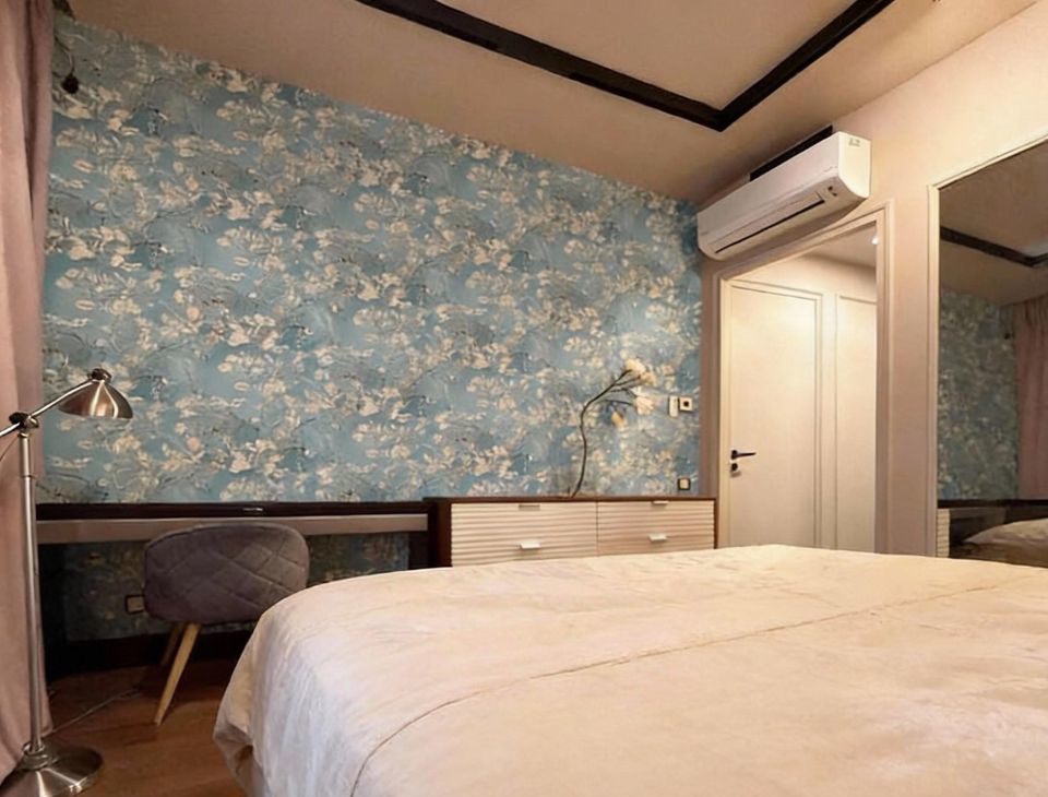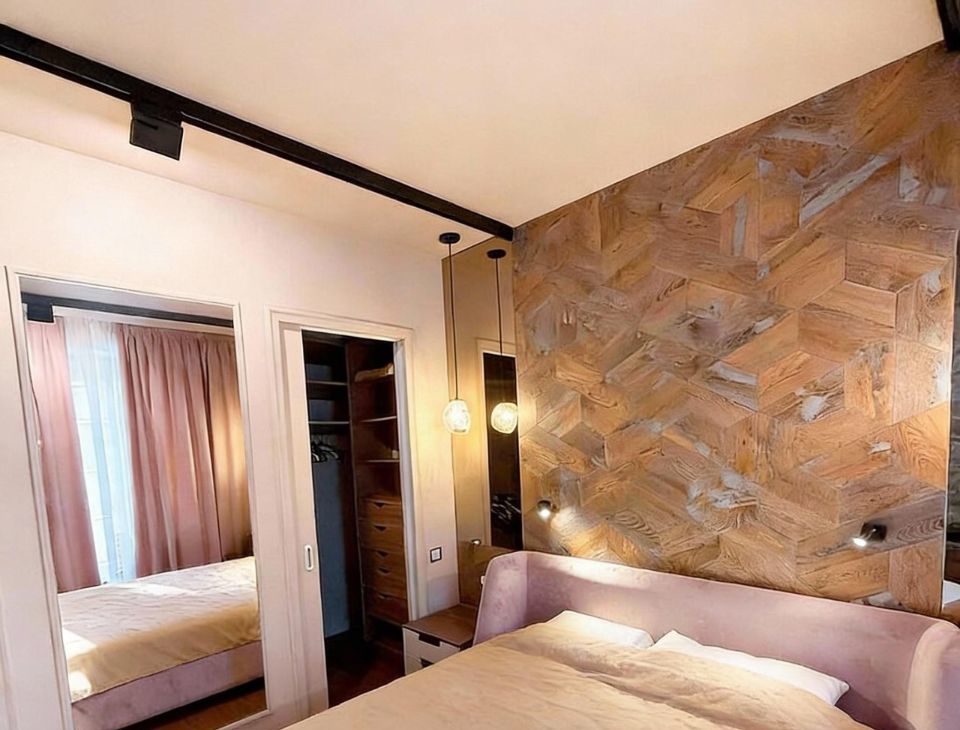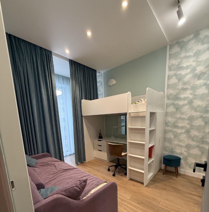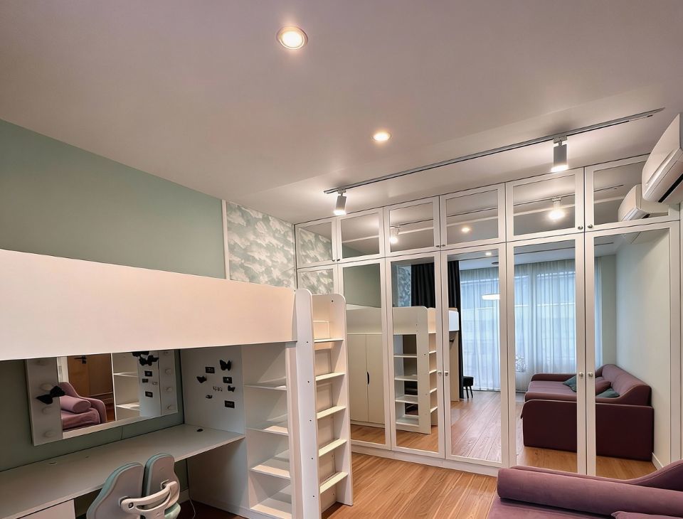 - Панорамные спальни: одна спальня оформлена для ребенка, вторая — с большой кроватью и гардеробной.