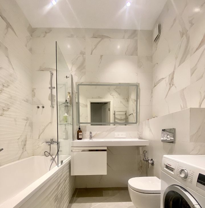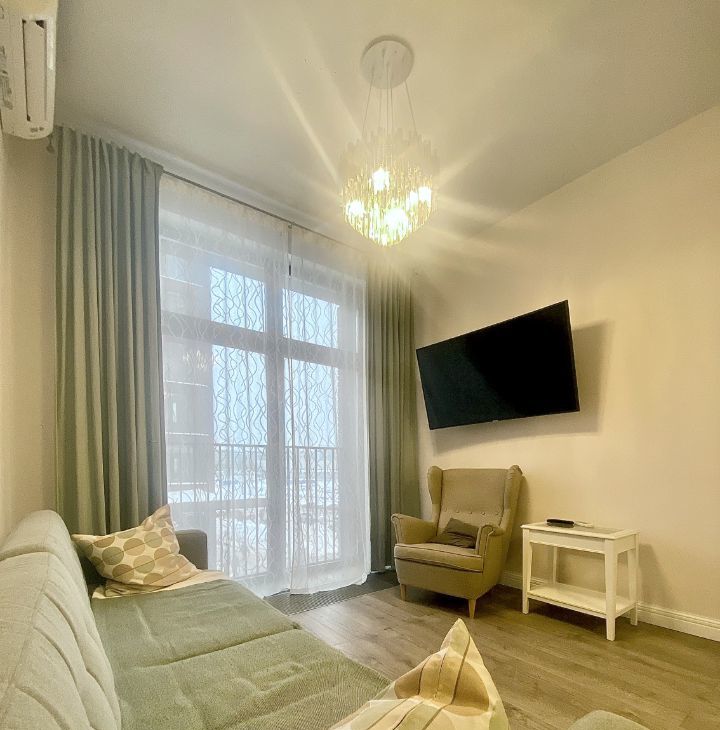 Квартира с дизайнерским ремонтом, есть вся необходимая мебель и техника. Планировка удобная: в квартире есть один совмещенный и один отдельный санузел, а также лоджия.