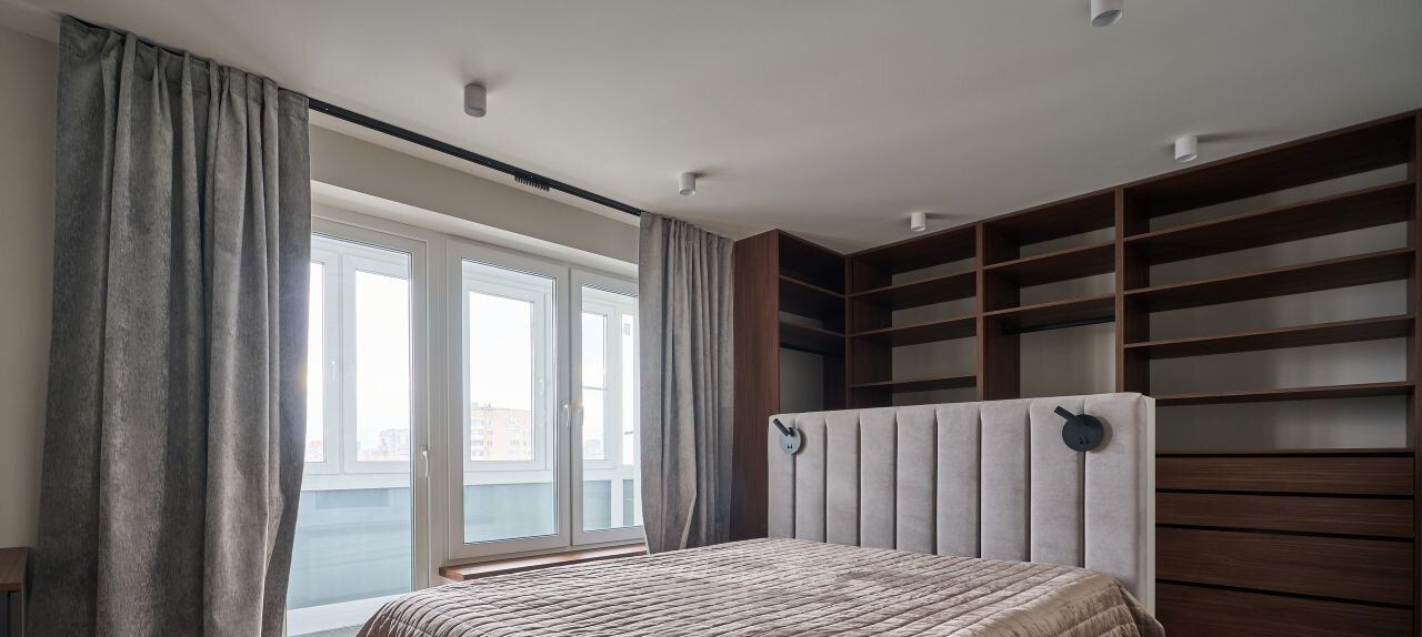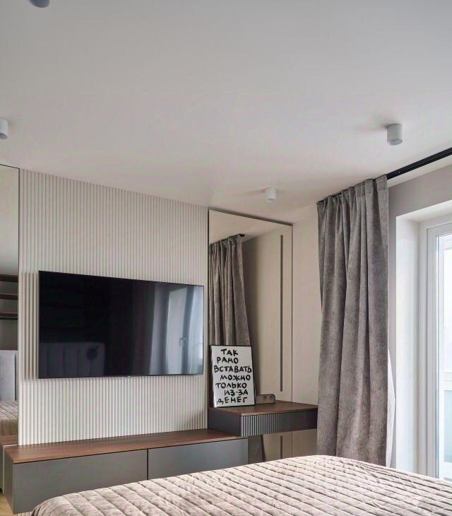 Планировка: мастер-спальня с гардеробной, вторая спальня, эргономичная кухня-гостиная с мягкой зоной, детская/кабинет и огромная лоджия вдоль всей квартиры.