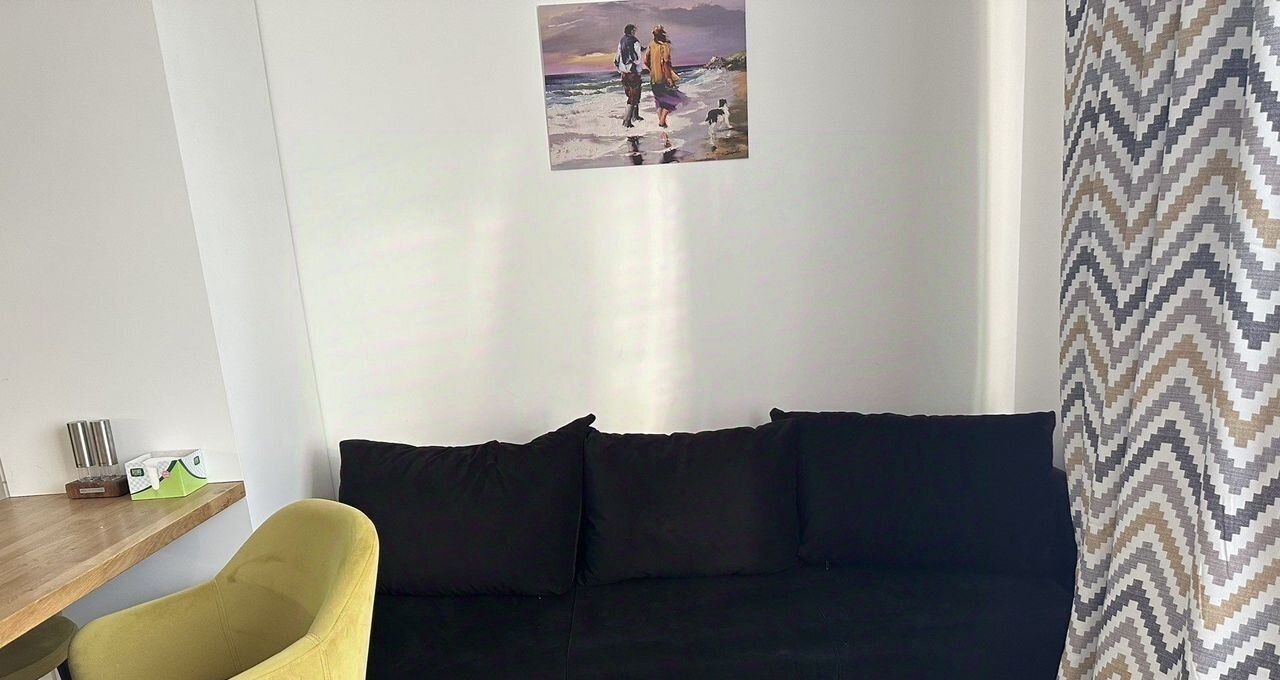 Посудомоечная машина, стиральная машина, телевизор, стильная мебель, раскладной диван кровать в кухне-гостиной.