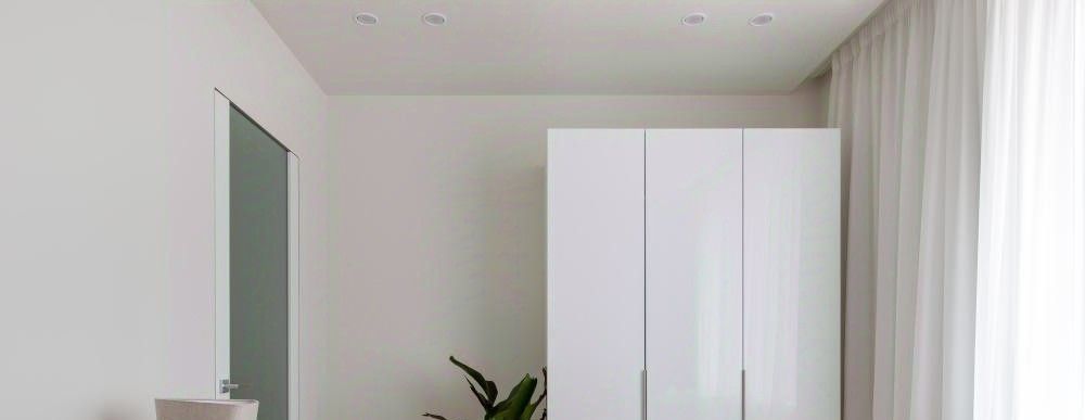 В квартире два совмещенных санузла. Один санузел с ванной, стиральной машиной и раковиной с зеркальной подсветкой, другой санузел-гостевой, с раковиной и туалетом. В прихожей разместили настенную вешалку с крючками, а также мягкий пуф.