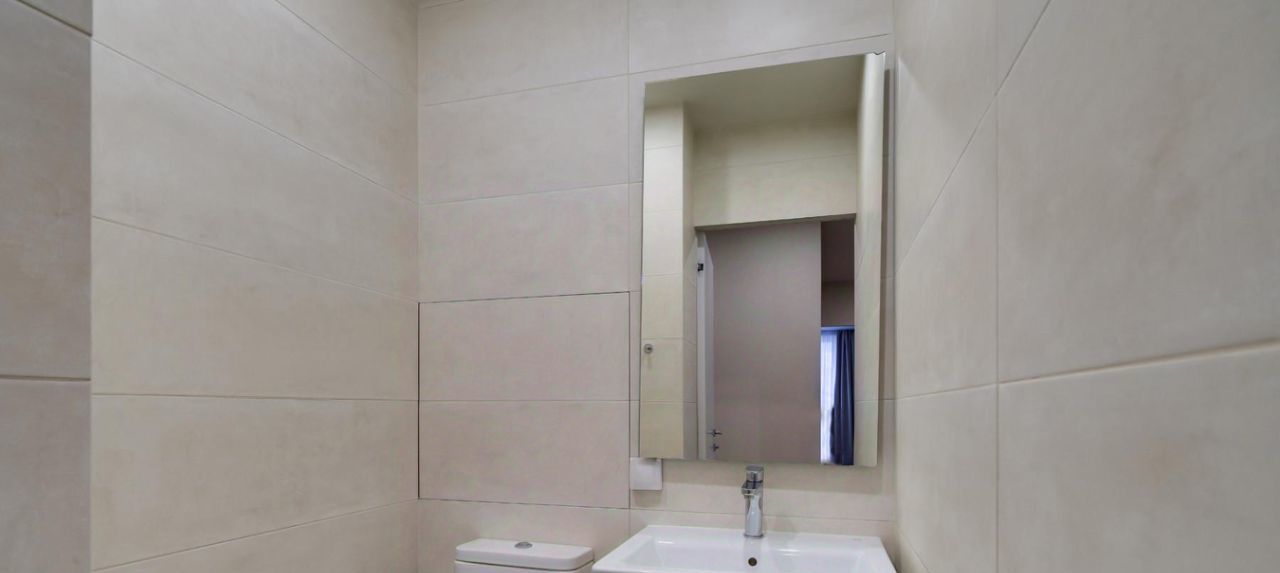 В квартире два совмещенных санузла. Один санузел с ванной, стиральной машиной и раковиной с зеркальной подсветкой, другой санузел-гостевой, с раковиной и туалетом. В прихожей разместили настенную вешалку с крючками, а также мягкий пуф.