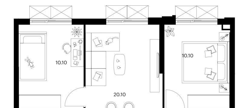 Спальня и рабочий кабинет/детская разделены залом, что позволяет создать уединение.