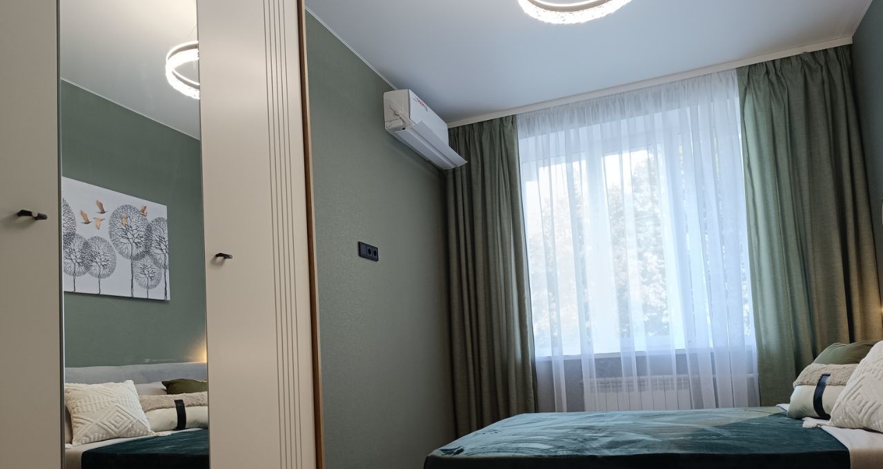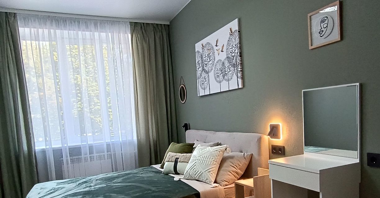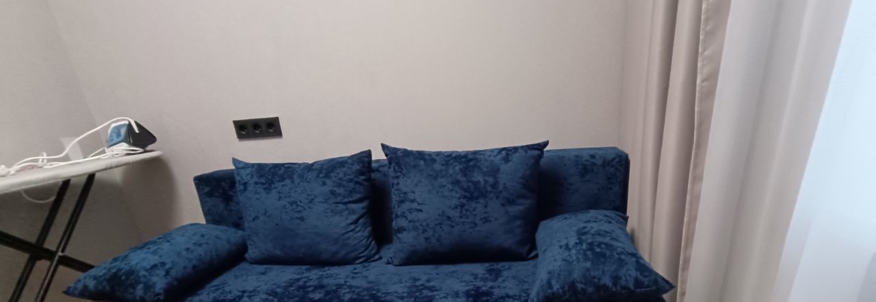 В квартире есть всё необходимое для комфортного проживания, большая спальня с кроватью, гостиная с диваном и детская, можно использовать как кабинет. Квартира теплая и уютная.