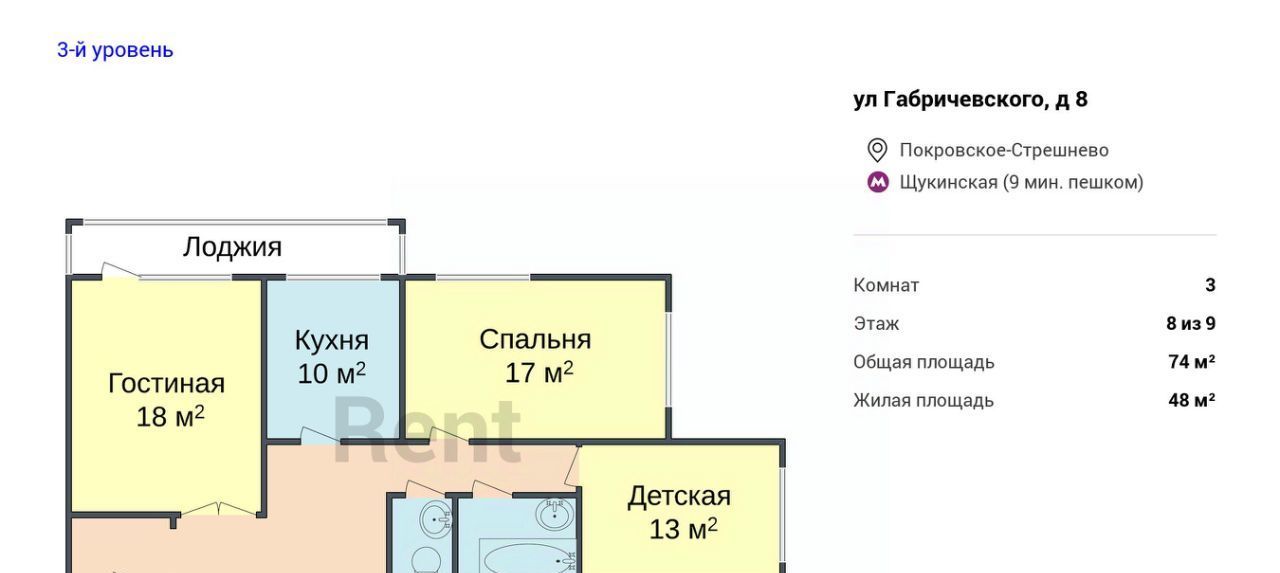 3-к кв. Москва ул. Габричевского, 8 (74.0 м²)