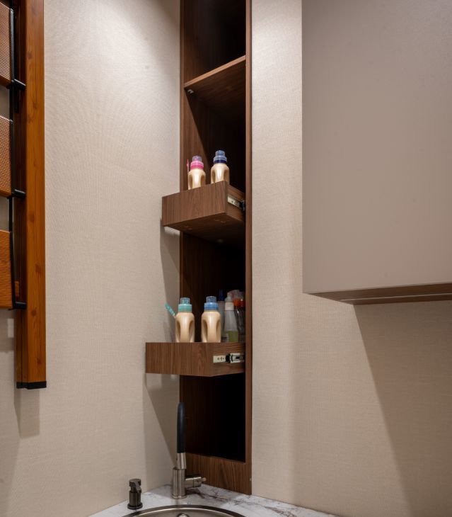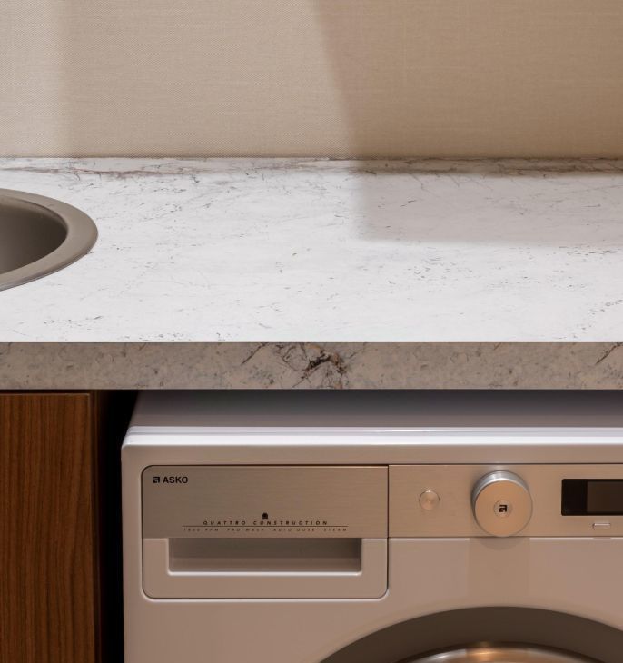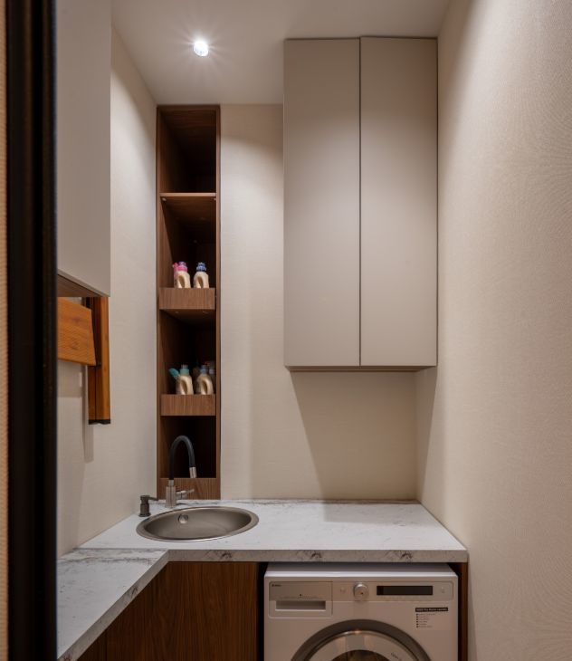 В квартире есть отдельное помещение, оборудованное под постирочную и комнату для хранения хозяйственных принадлежностей.