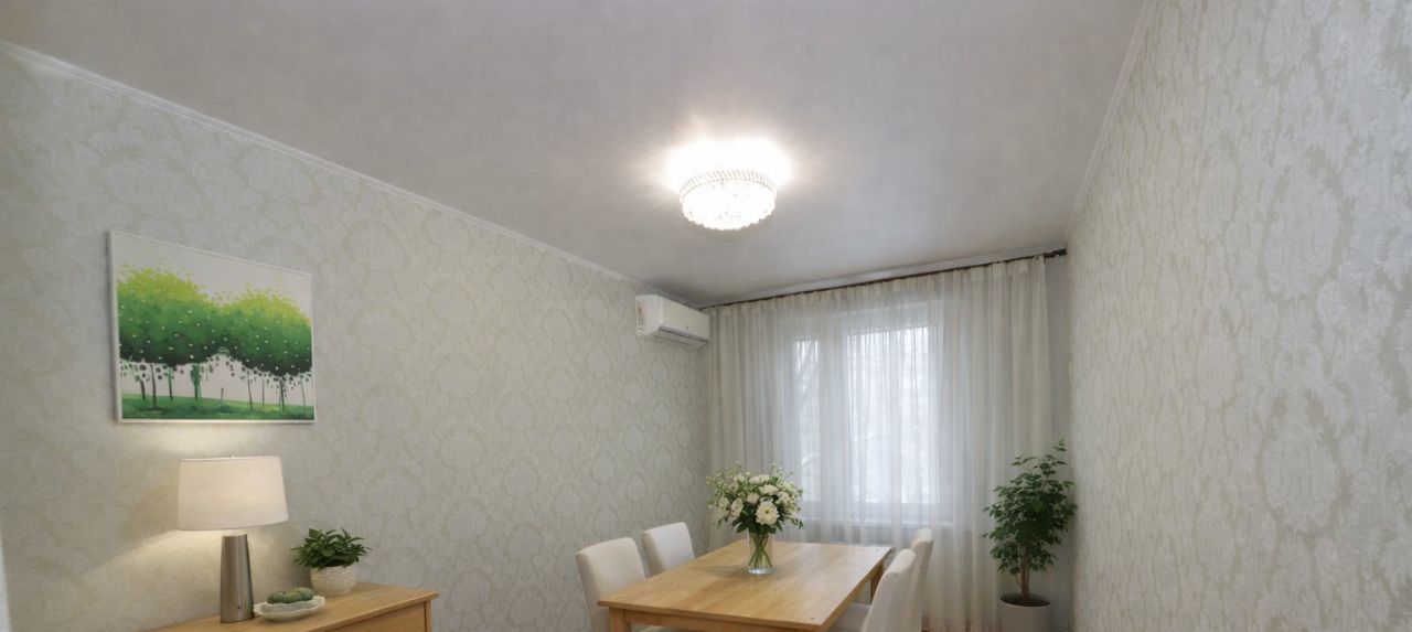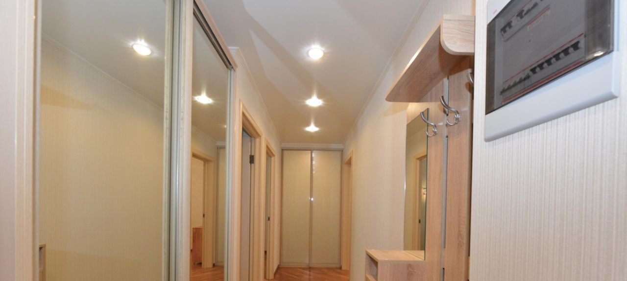 Три изолированные комнаты и гардеробная. Выполнен качественный ремонт, заменена электропроводка. По всей квартире паркетная доска, установлен электрический подогрев пола. В каждой комнате и на кухне есть кондиционеры. Квартира полностью укомплектована: встроенная кухня, холодильник, стиральная машина, мебель в прихожей, шкафы купе, спальня, телевизор.