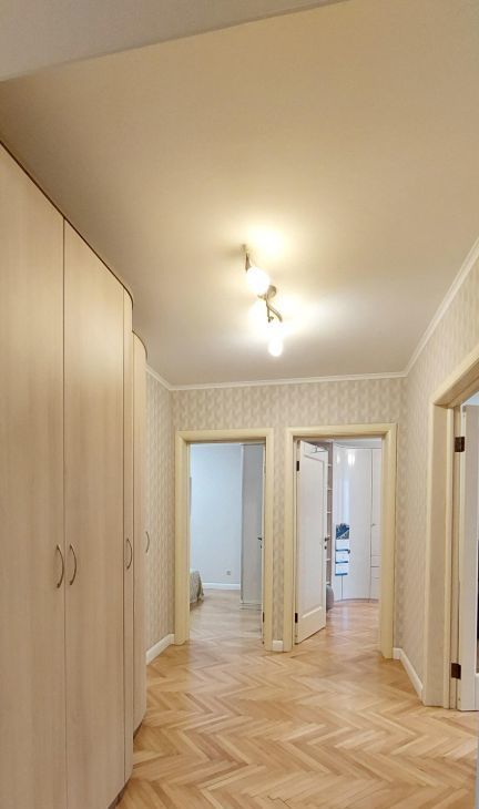 Светлые обои, полы - паркет + керамогранит с подогревом в прихожей, в кухне и в сан.узлах. Выполнена шумоизоляция, соседей не слышно совсем.
