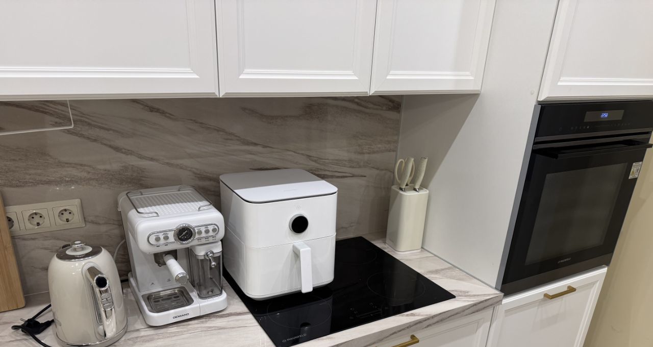 Кофемашина, аэрогриль, посудомойка, чайник. Также вся необходимая кухонная утварь.