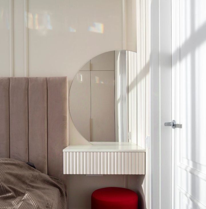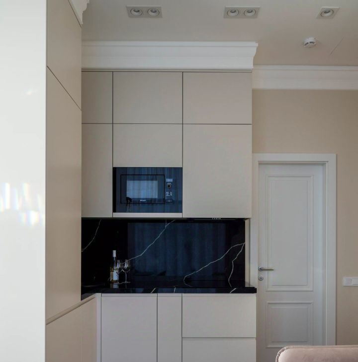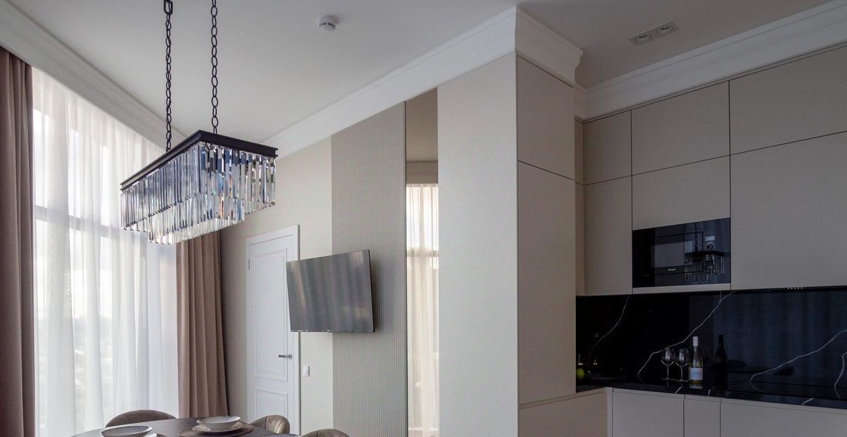 Интерьер — сдержанная современная классика без избыточности. Встроенная техника, продуманное хранение, качественные материалы. Пространство организовано так, чтобы поддерживать рабочий ритм и давать возможность переключаться.