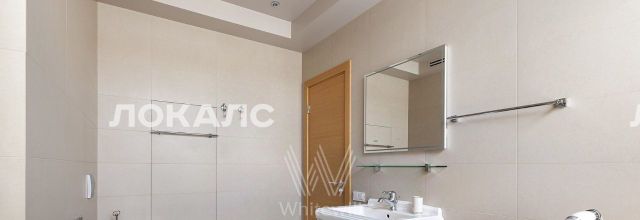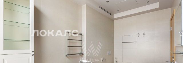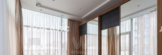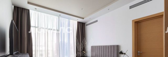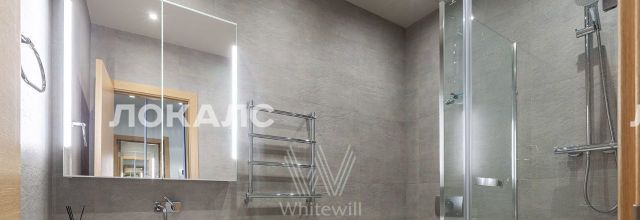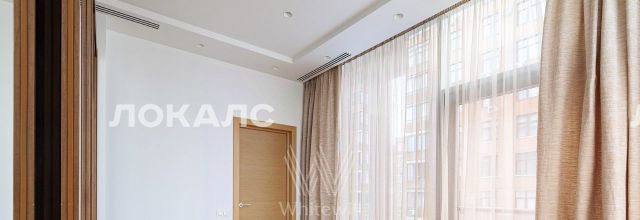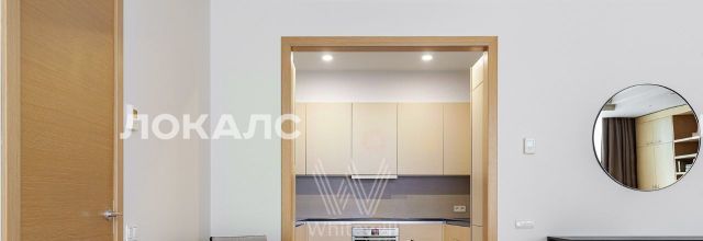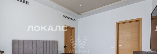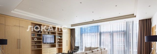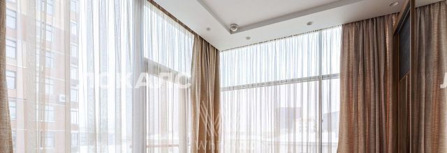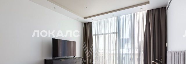 Планировка включает кухню-гостиную с мягким угловым диваном, мастер-спальню с персональной ванной комнатой, вторую комнату, которую можно использовать под гардеробную или кабинет, холл и гостевой санузел с душевой. В квартире с потолками 3,2 метра установлена мебель, встроенная бытовая техника, приточно-вытяжная система вентиляции и кондиционеры. Благодаря панорамным окнам помещение наполнено светом. Машиноместо в подземном паркинге включено в стоимость аренды.