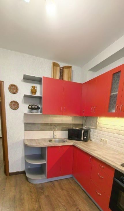Кухня (8.2 м²): Просторная, с ярким современным гарнитуром. Полностью укомплектована техникой: встроенный духовой шкаф, газовая варочная панель, вытяжка, микроволновка, вместительный холодильник. Обеденная зона для всей семьи.