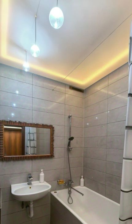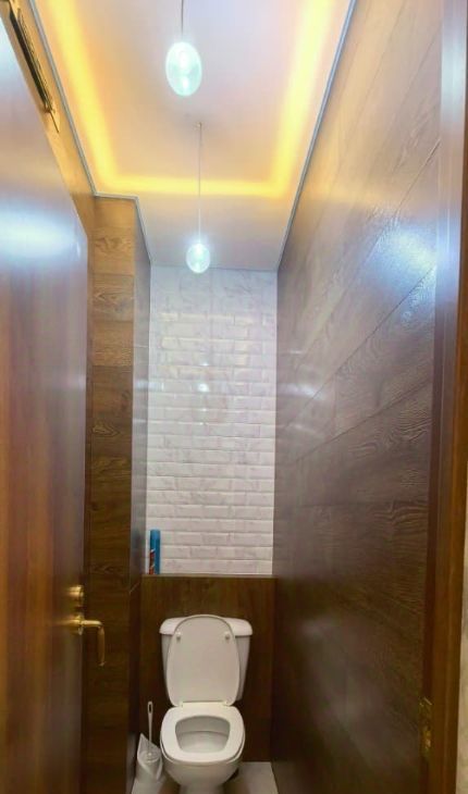 Санузлы (раздельные): Выполнены в стиле современного эко-минимализма. В ванной и туалете реализован сложный двухуровневый свет (парящий потолок с контурной LED-подсветкой и стильные подвесные сферы) — выглядит очень дорого и атмосферно.