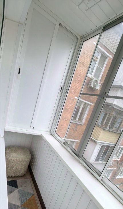 Балкон: Застеклен современными раздвижными окнами, утеплен, обшит светлыми панелями. Прекрасное дополнительное место для утреннего кофе или отдыха.
