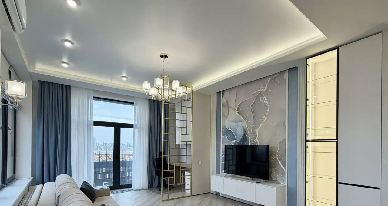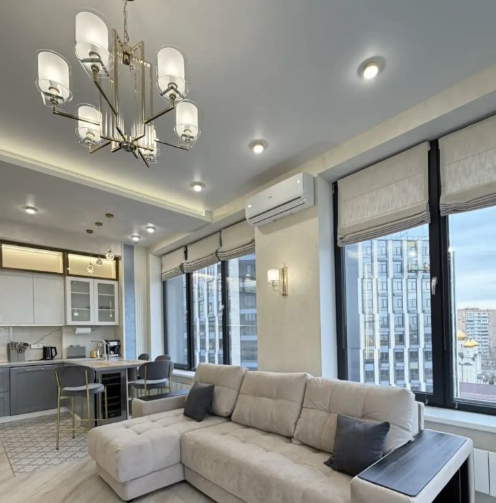 Функциональная планировка - большая кухня-гостиная, изолированные мастер-спальня и детская комната, 2 санузла, гардеробная комната, 2 французских балкона.