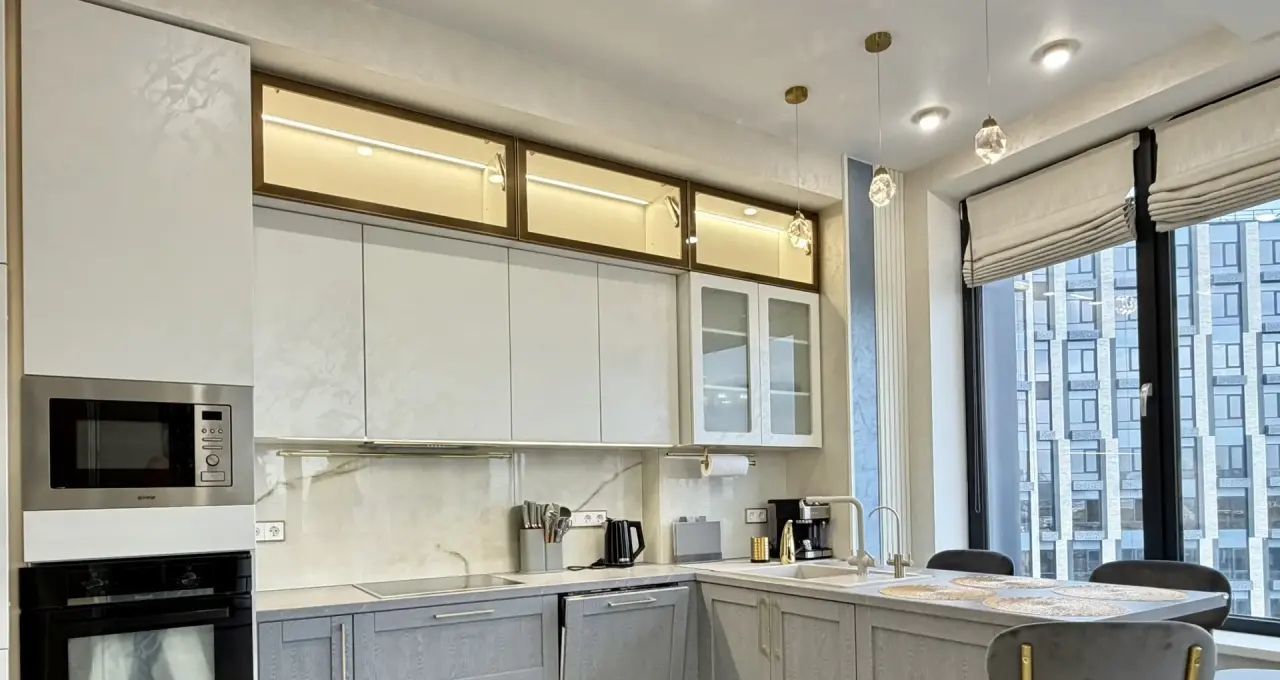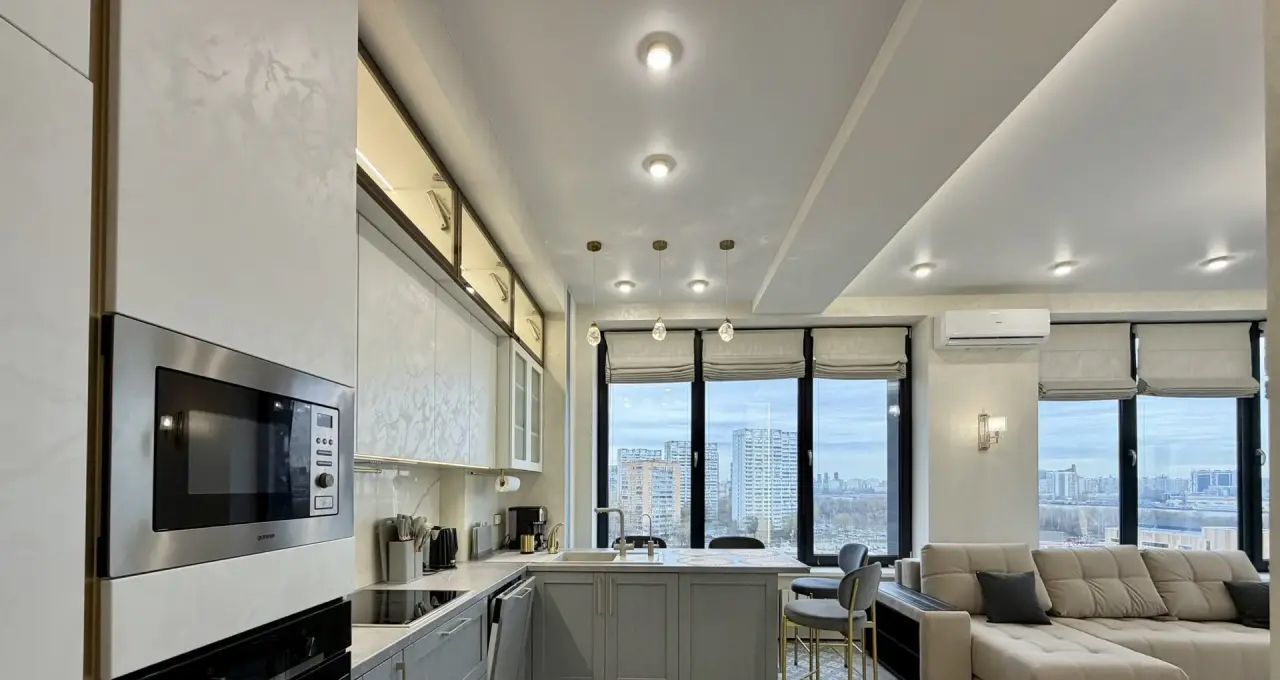 Квартира укомплектована всей необходимой мебелью и бытовой техникой для комфортного проживания, включая посудомоечную машину, стиральную и сушильную машины, кондиционер, винный шкаф, система фильтрации питьевой воды, шкаф для сушки белья. Продуманная система хранения вещей - большое количество встроенных вместительных шкафов и гардеробная комната.