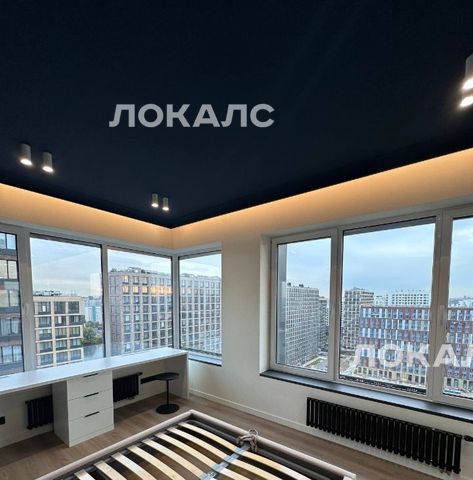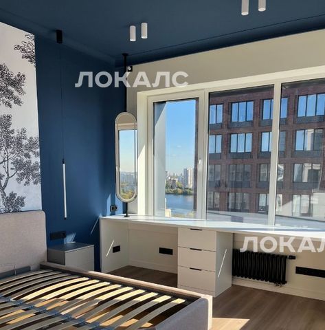 Много сценариев освещения и мест для хранения. В большой спальне — рабочий стол и кресла для двоих. Есть зона для макияжа — большое поворотное зеркало с подсветкой. Вторая спальня со встроенным шкафом: может стать детской или кабинетом по желанию. Шторы есть — попали не на все фото.