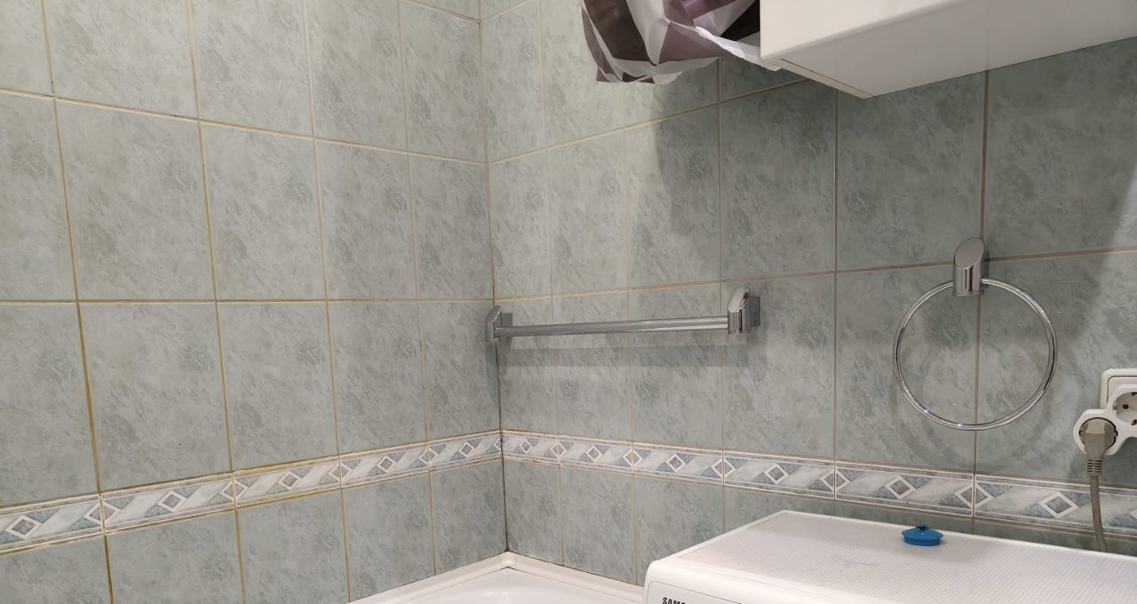 В санузле ванная и стиральная машина, есть полка.
