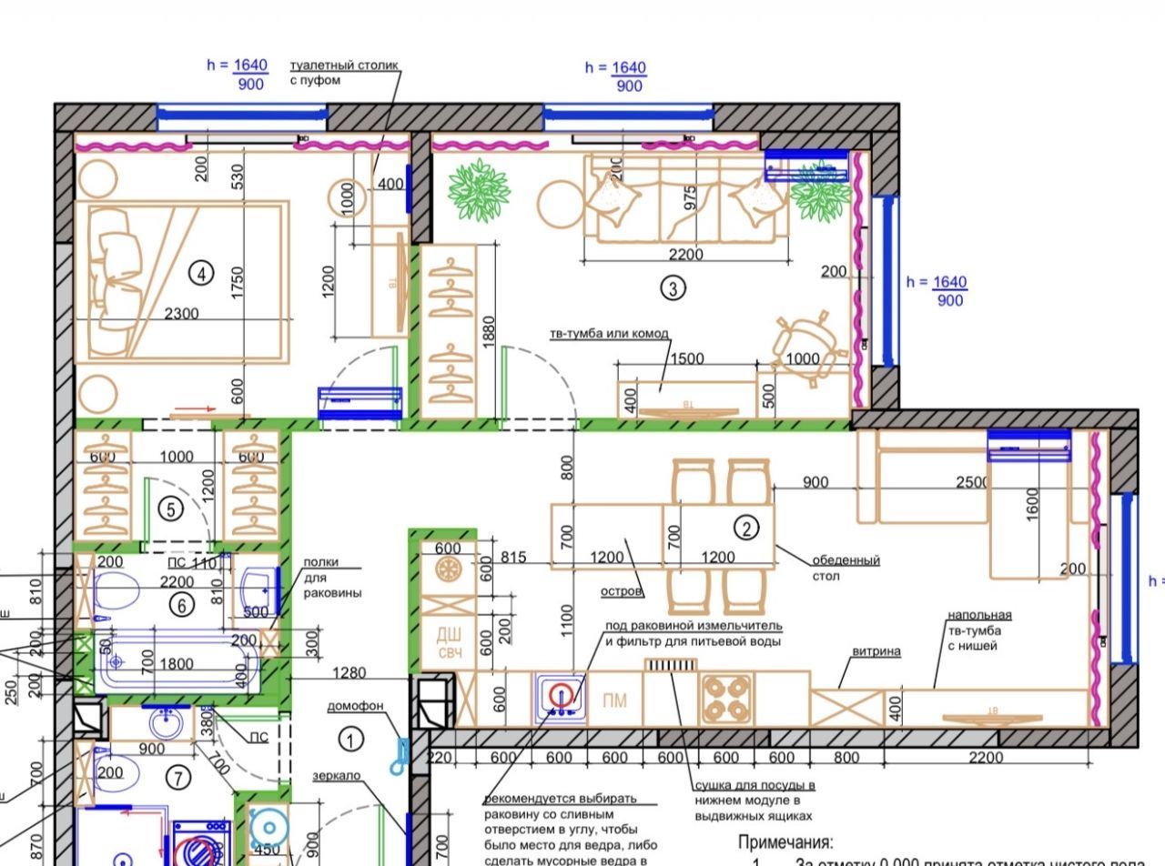В квартире предусмотрена мастер-спальня со своим туалетом и проходной гардеробной. Кухня будет вся из ЛДСП Egger, столешница из камня, петли и ящики — все Blum.