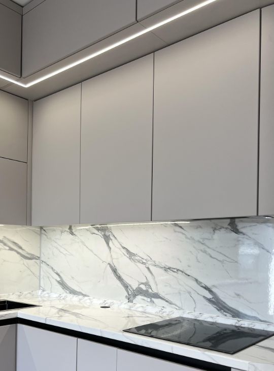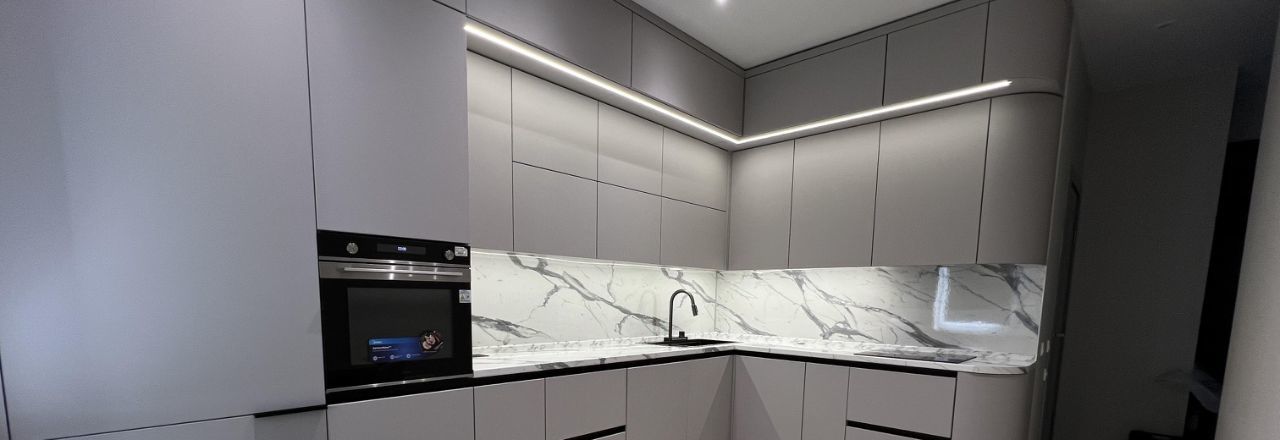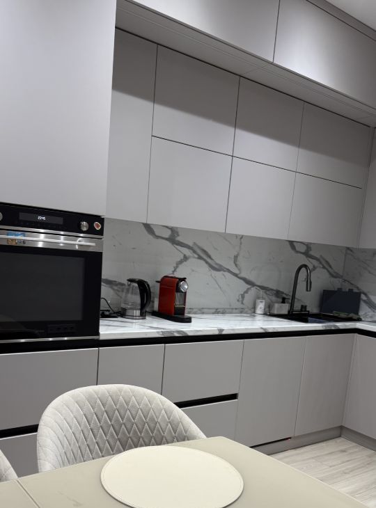 Большая кухня с качественной техникой, мойка с измельчителем отходов.