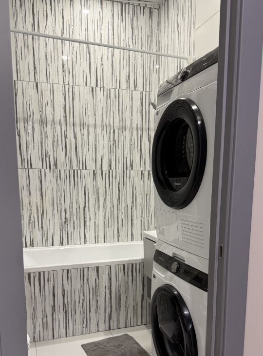 Два совмещенных санузла: с душевой и с ванной, где установлены стиральная и сушильная машины.