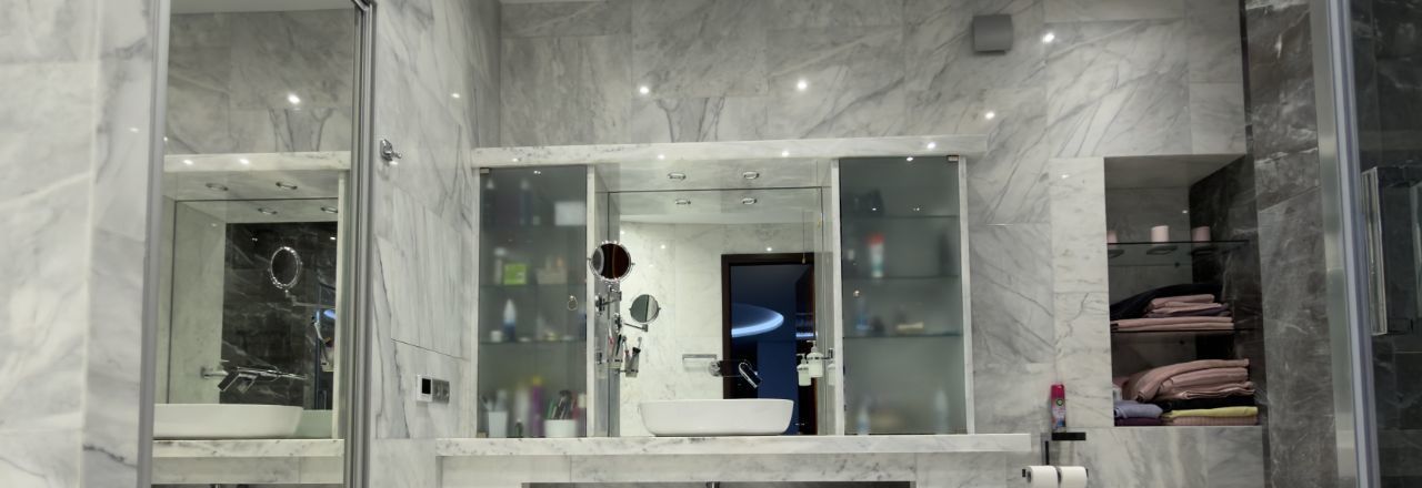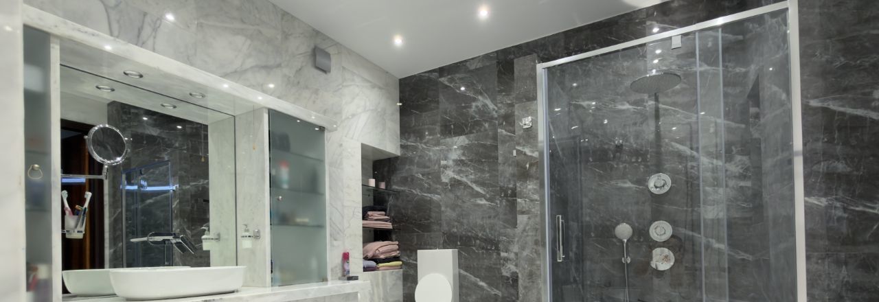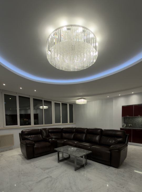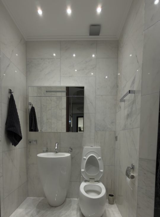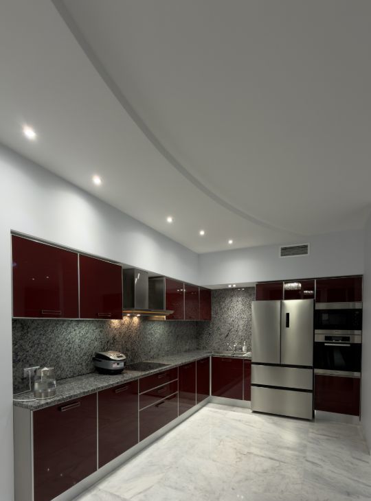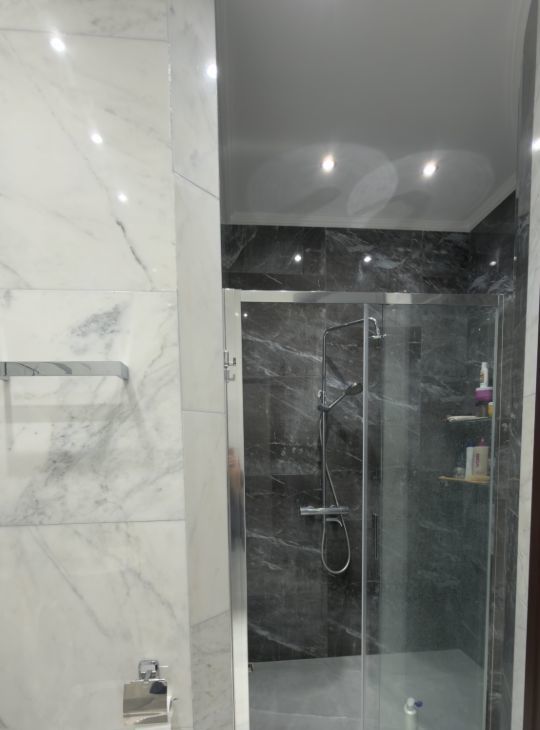На кухне гранитная столешница, пол полностью из мрамора , а так же санузлы.