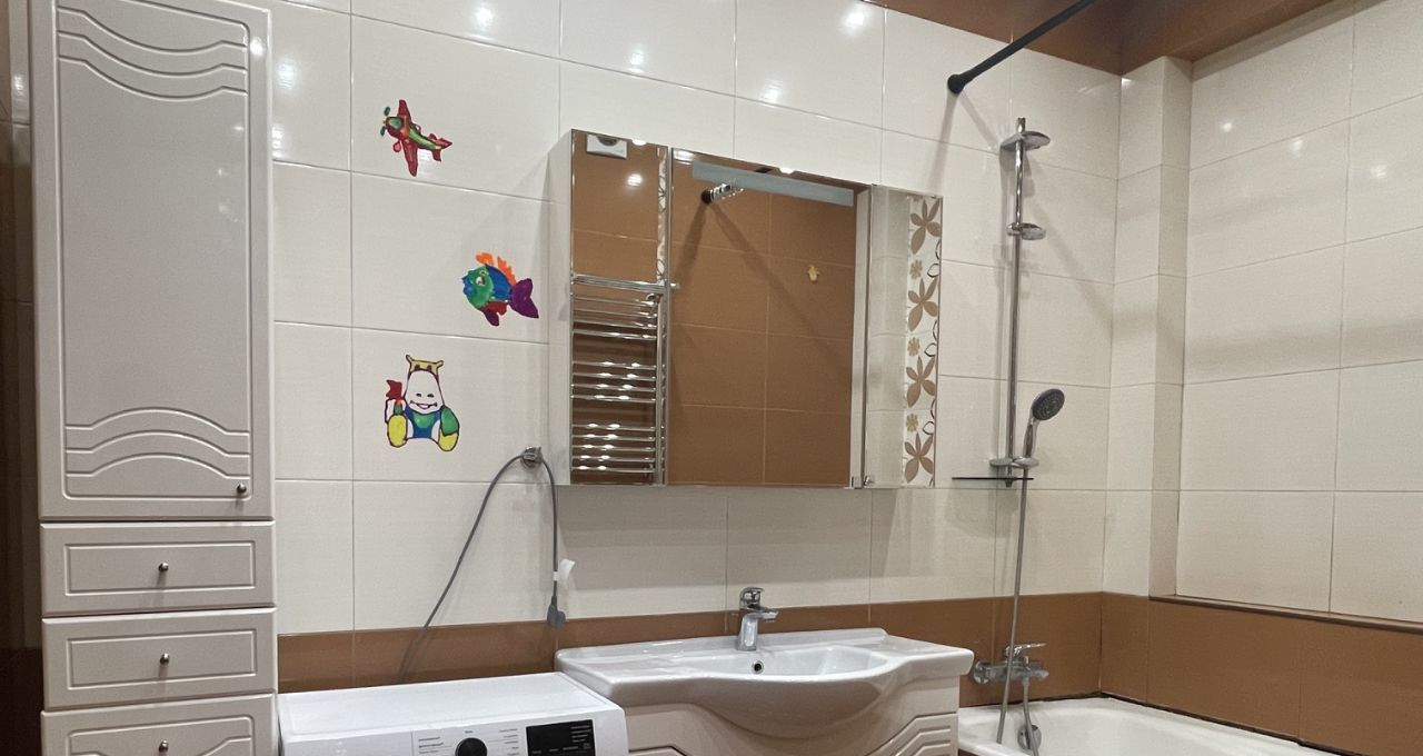 Внушительных размеров ванная комната с выделенными функциональными зонами, оборудованная отличной сантехникой, бойлером, спецтелевизором с повышенной влагоизоляцией.
