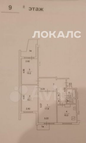 Распашонка общей площадью 72,9 кв. м. Три отдельные комнаты 17,9; 13,2 и 13,1 кв. м. Просторный коридор 13,3 кв. м. Кухня 10,2 кв. м. Два балкона (один застеклен) 2,6 кв. м.