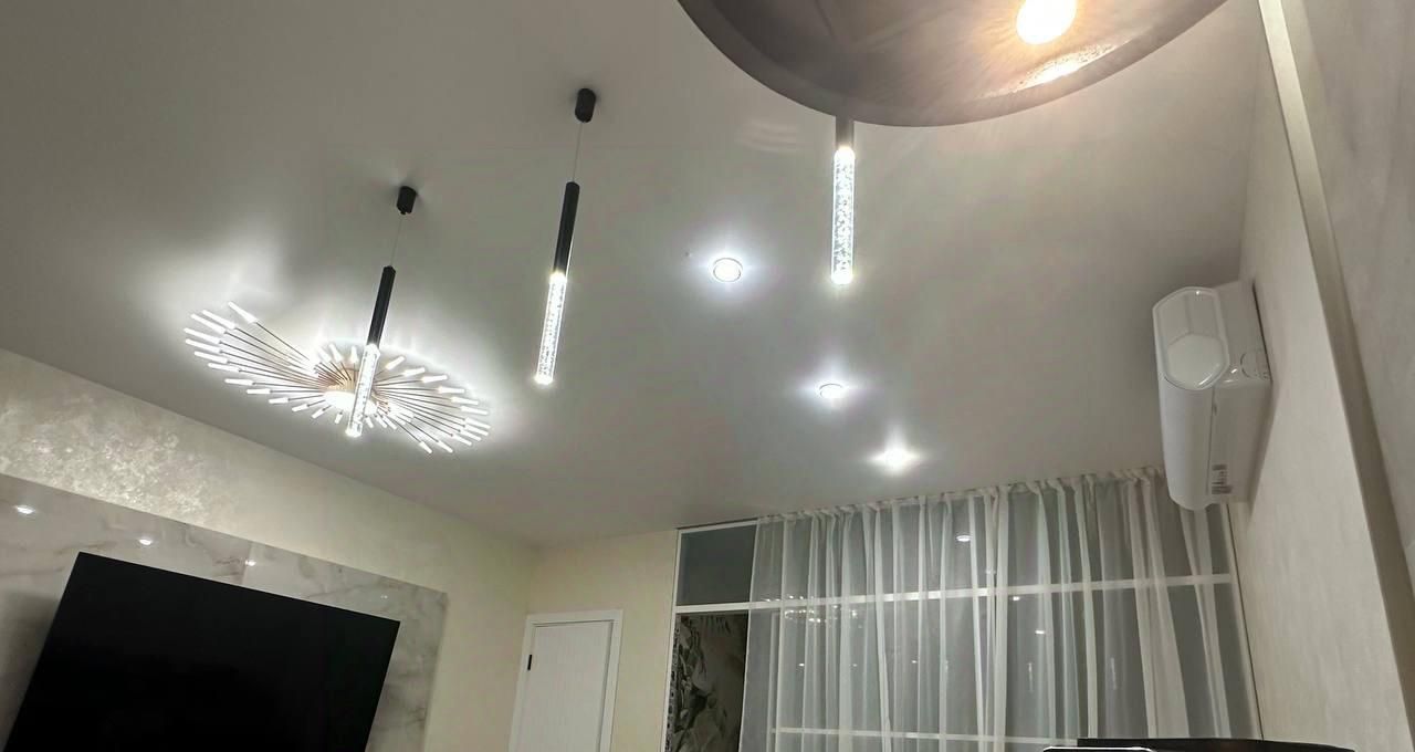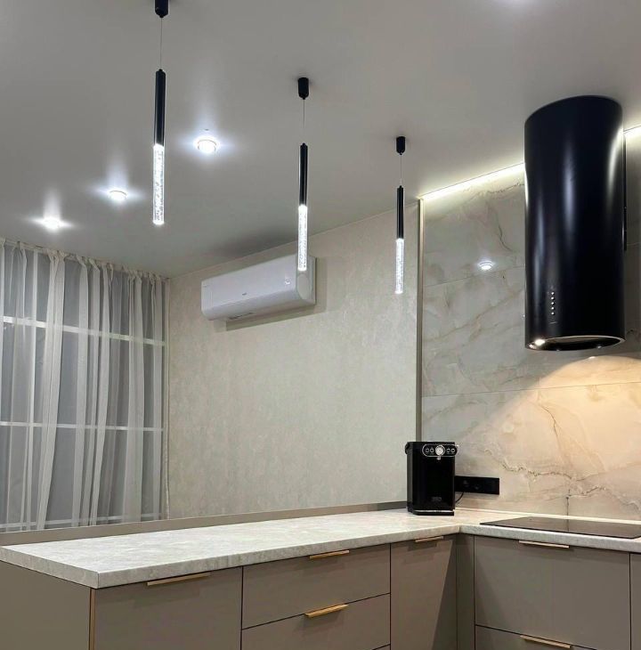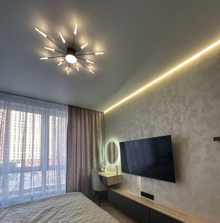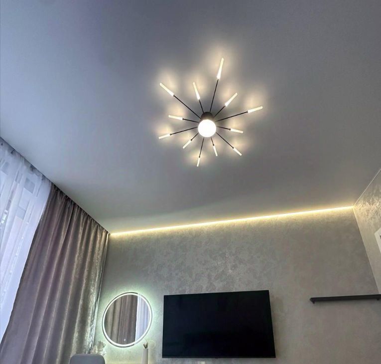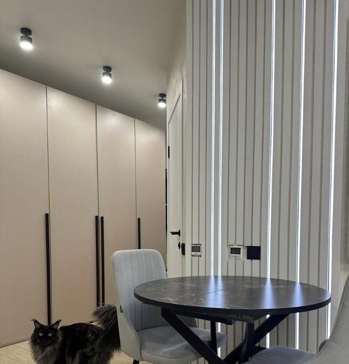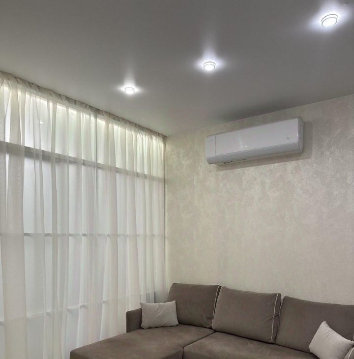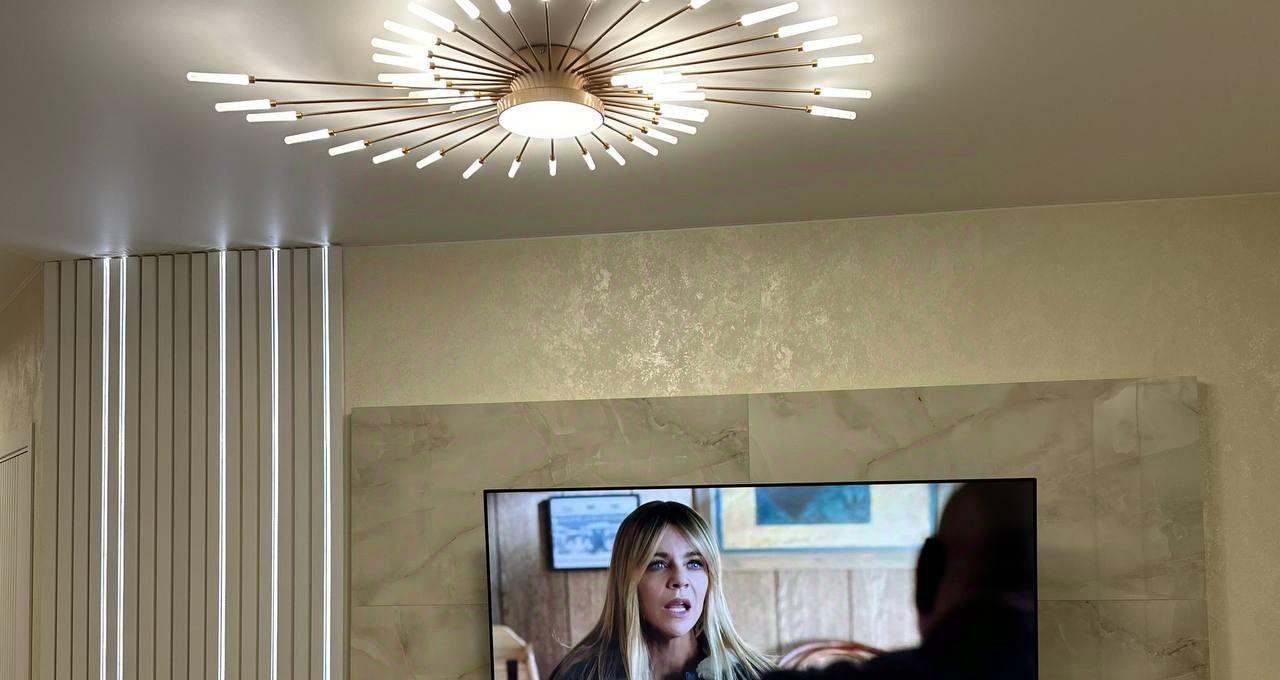 В гостинной: большой диван, телевизор (65 дюймов), стеновые панели с подсветкой, работающей в разных режимах, телевизор закреплен на пано из керамогранита, стол, стулья, кондиционер.