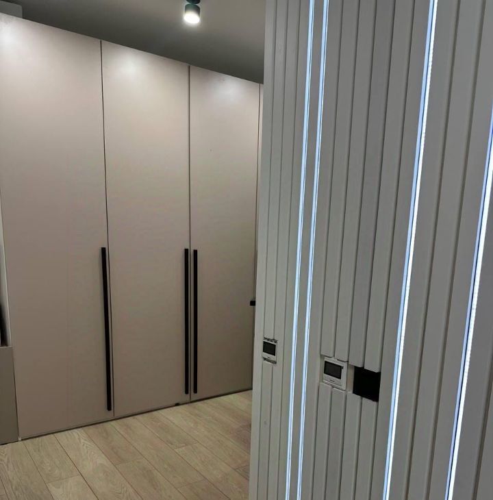 В большой спальне размещена гардеробная. Есть вся необходимая мебель: две кровати (ортопедический матрас), тумбочки, комоды, трюмо, зеркало с подсветкой, телевизор