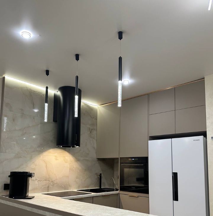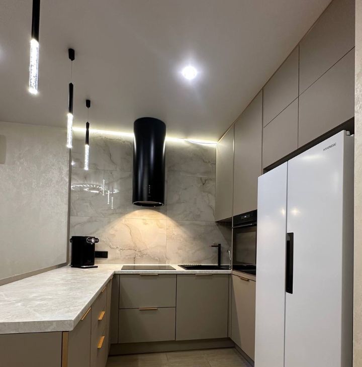 В кухне есть все необходимое: большая посудомоечная машина, духовка с функцией микроволновой печи, варочная панель, большой холодильник, чайник, установлена система фильтрации воды и дополнительный питьевой кран, вытяжка, кухонный фартук изготовлен из керамогранита, большая зона хранения посуды и продуктов.