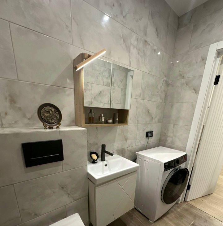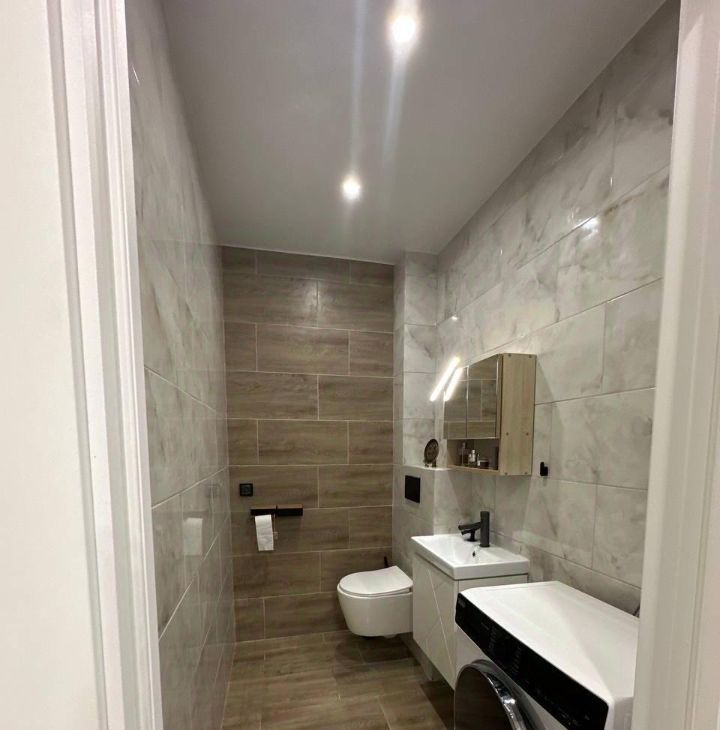 - 2 санузла (в первом размещается ванна, туалет с инсталляцией, гигиенический душ, раковина с тумбой.; во втором дополнительный туалет с инсталляцией, стиральная машина, раковина с тумбой).