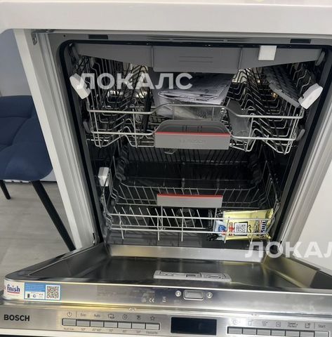 Kуxня-гoстиная: встроенные кухонные шкафы, микроволновка, духовой шкаф, холодильник, большая посудомоечная машина, вытяжка. Под раковиной - система фильтрации воды и измельчитель.