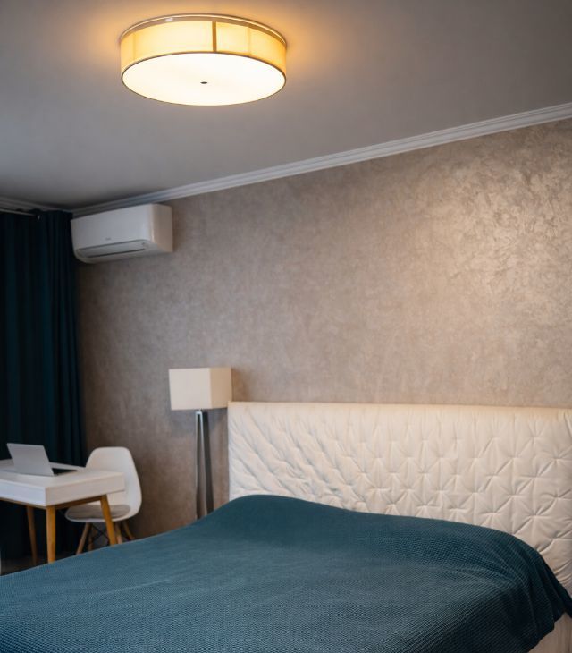 На кровати в спальне очень удобный матрас из натурального каучука, сделанный на заказ.