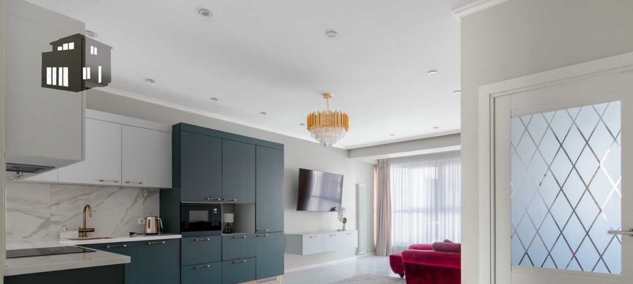 Планировка: современная кухня совмещённая с гостиной, две изолированные комнаты с мебелью, совмещённый санузел с душевой кабиной. Есть гардеробная. Окна квартиры выходят во двор.
