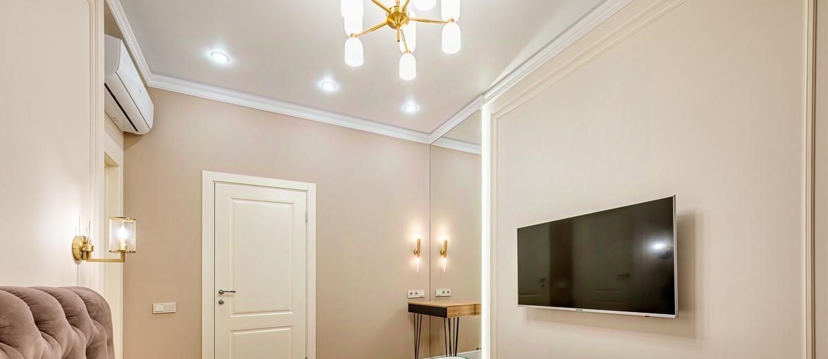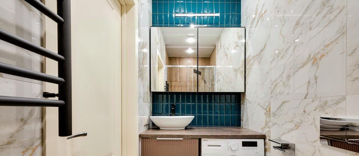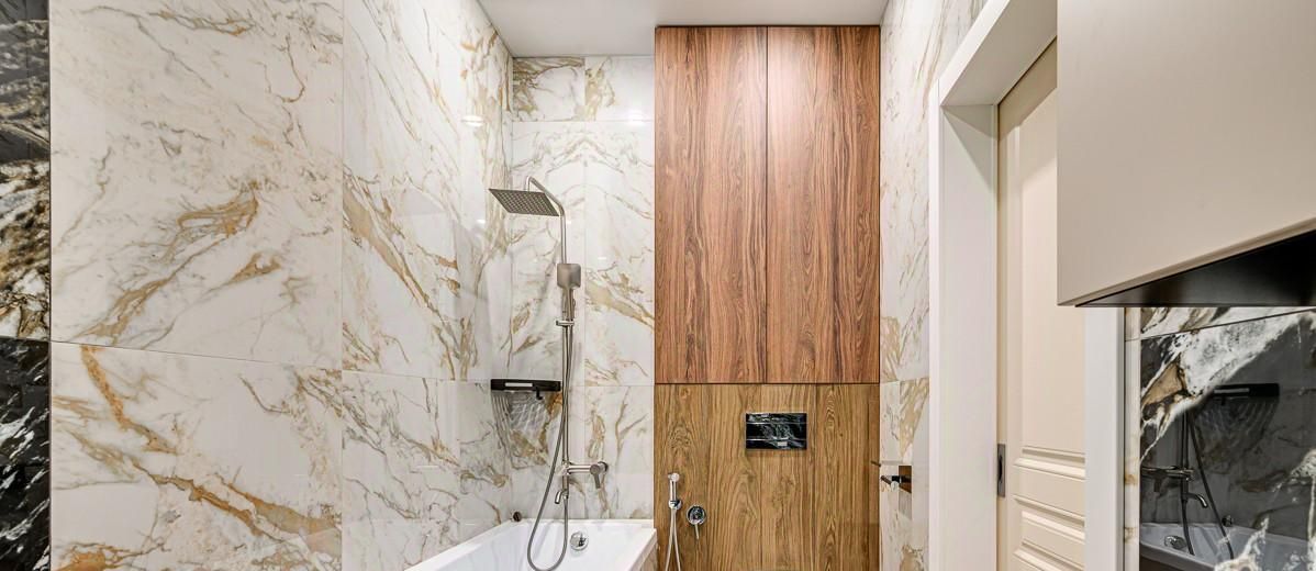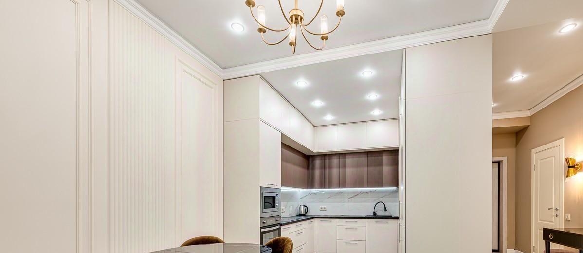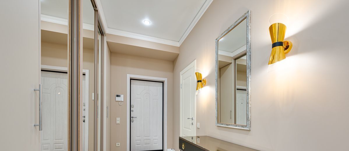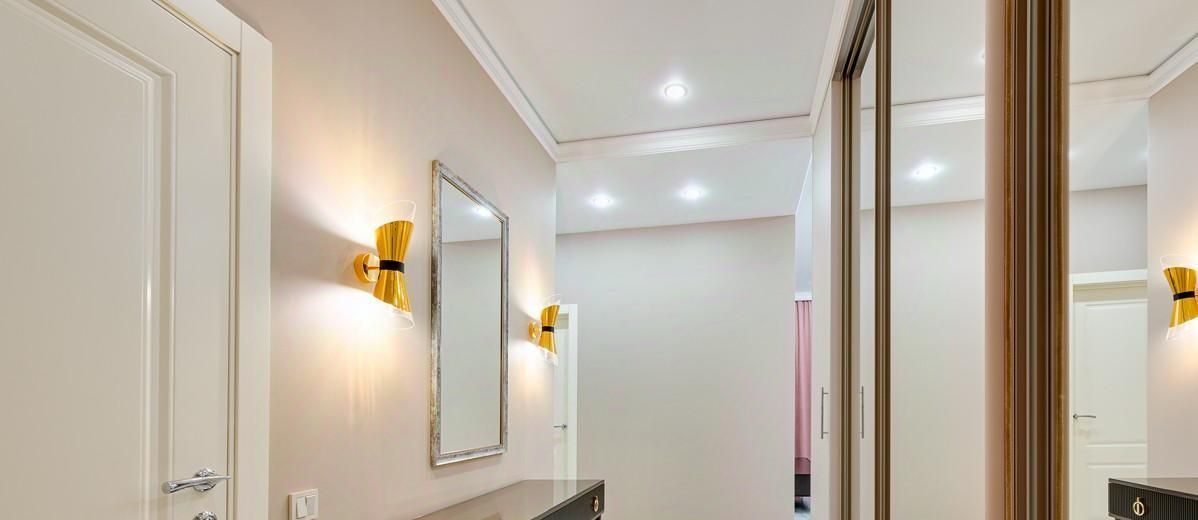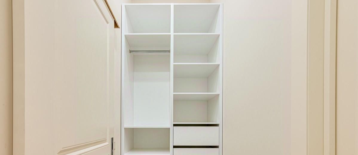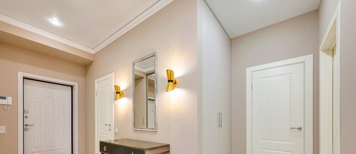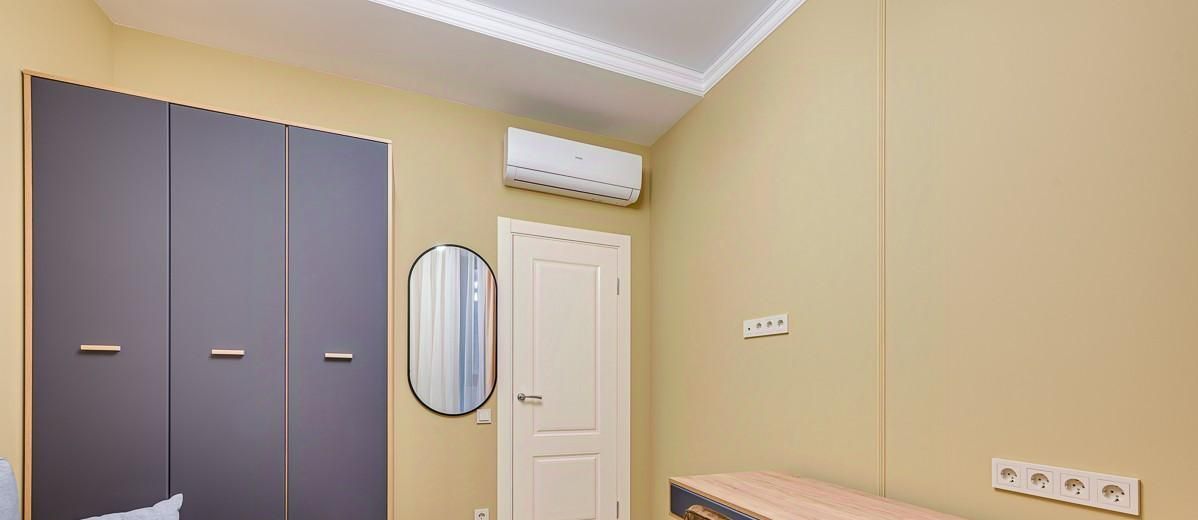 Планировка включает кухню-гостиную, кабинет или спальню, спальню с гардеробной, а также два полноценных санузла. При входе расположен большой шкаф от пола до потолка для удобного хранения вещей.