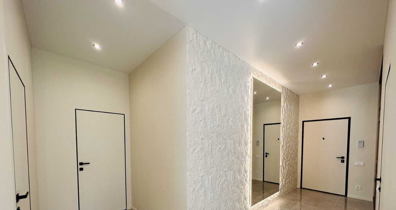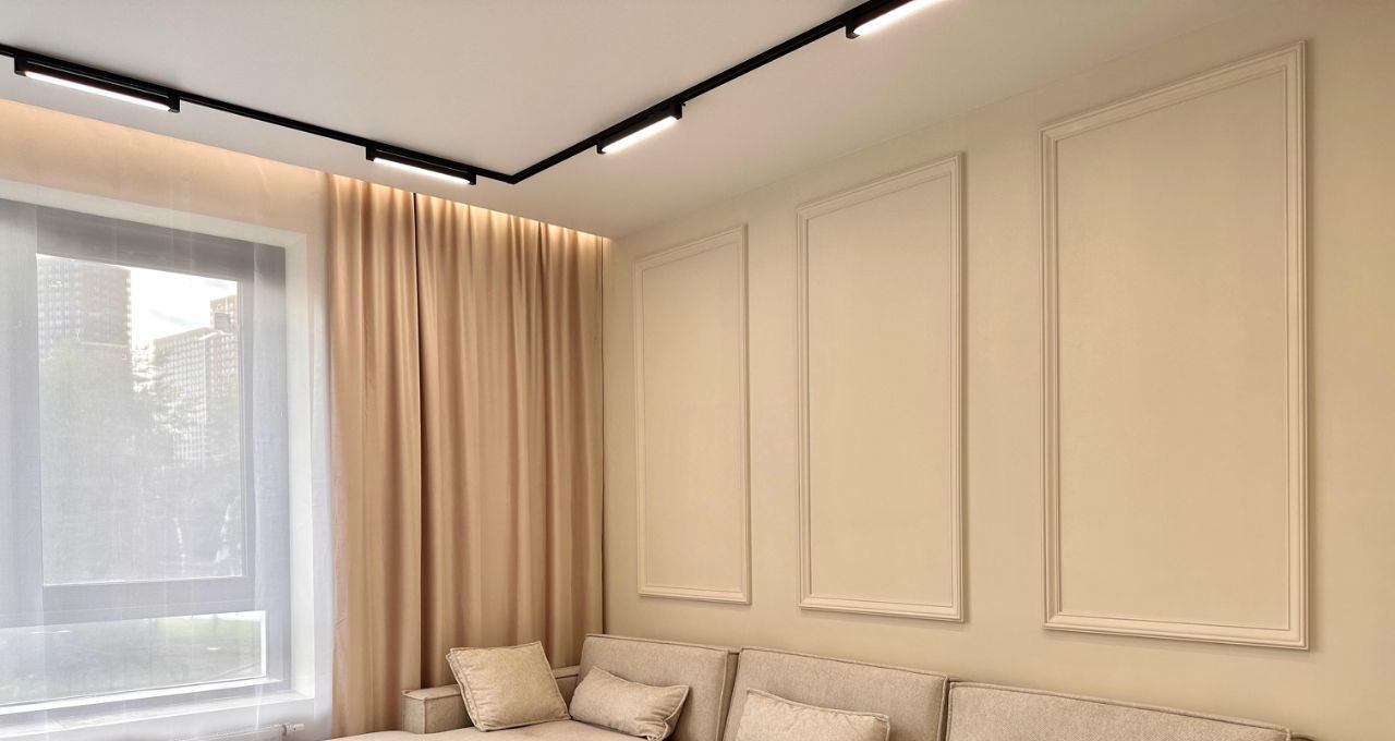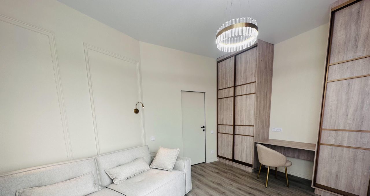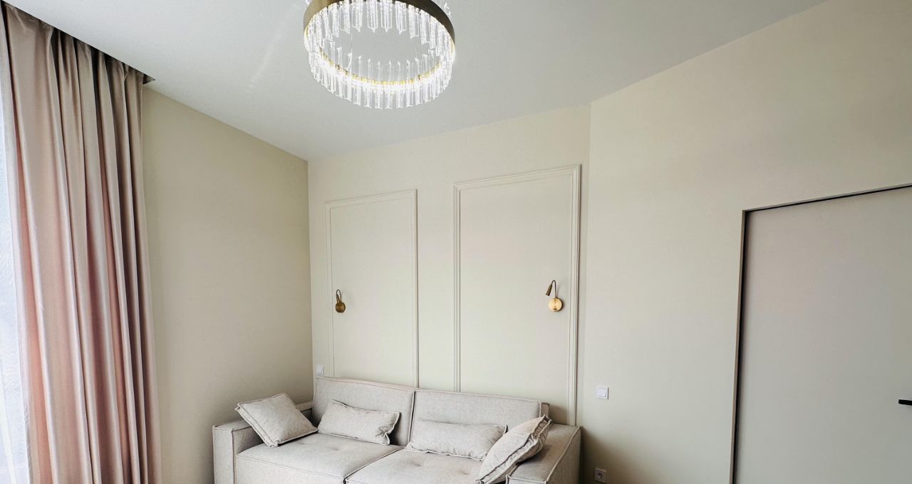 Трековое освещение с регулировкой направления света, люстры с выбором режима освещения. Подсветки в нишах для штор. Мастер-выключатель. Крупноформатные настенные слэбы. Мягкая мебель высокой категории ткани, оба дивана со спальным местом с наполнением memory-foam.