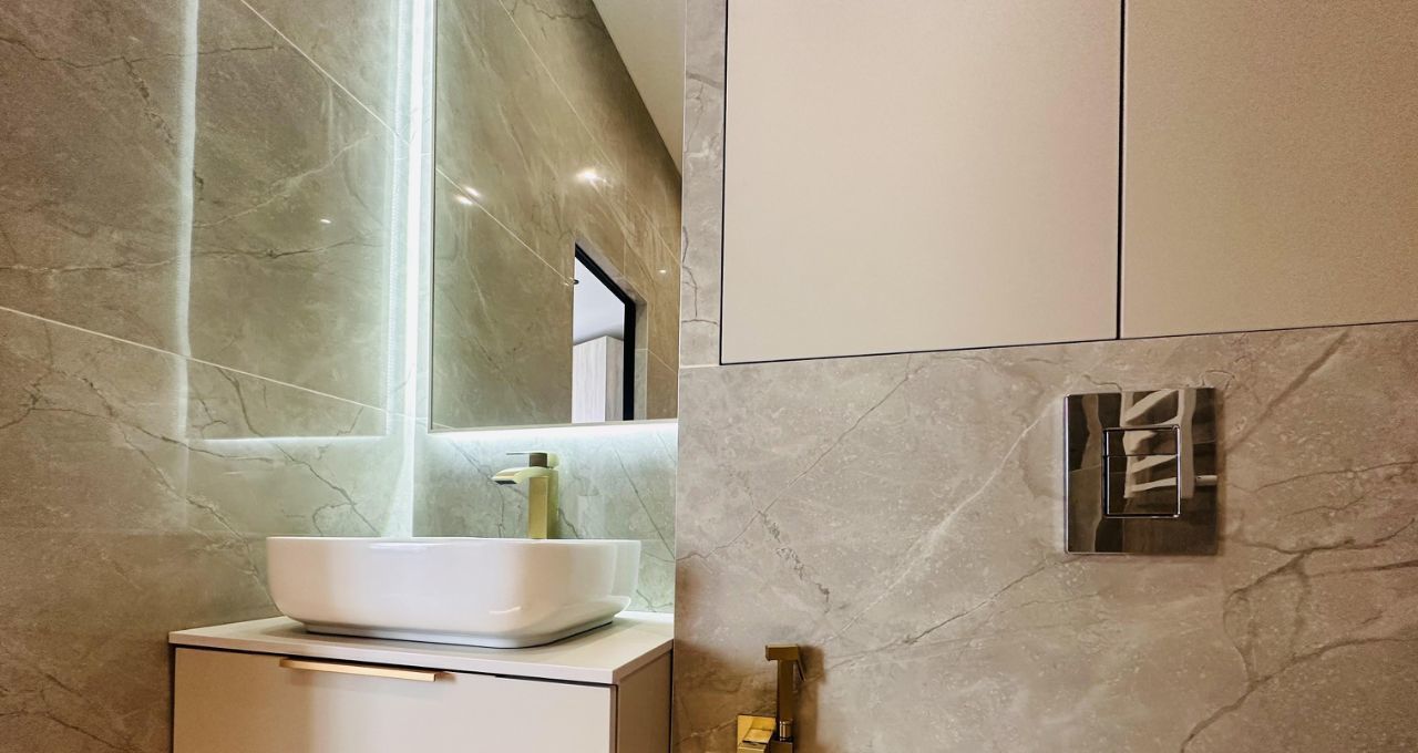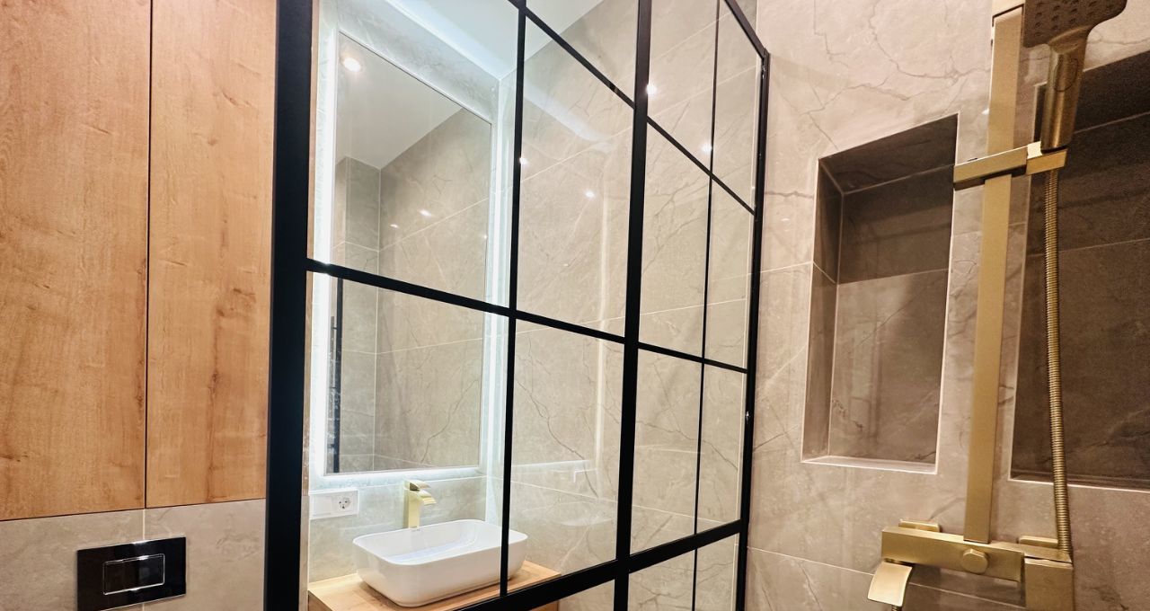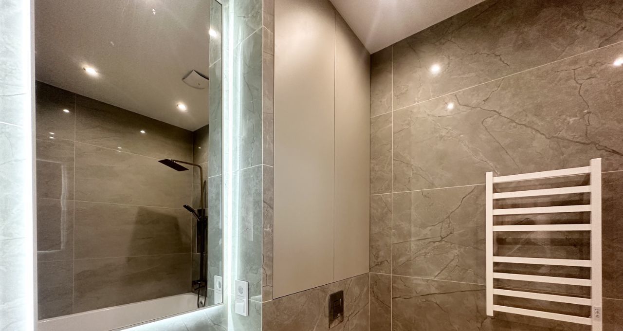 В стенах встроены декоративные теневые профиля. Часть стен оформлена в виде скалы. Сантехника grohe, замена всей инженерии от застройщика, системы защиты от затопления
