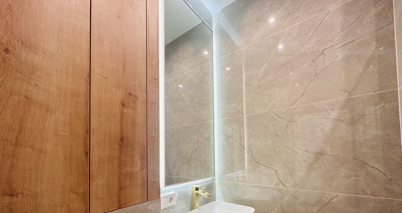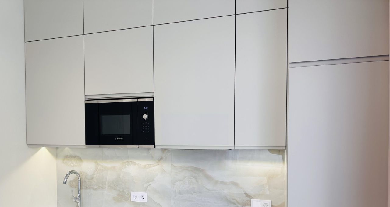Премиум кухня с фурнитурой Blum, встроенной техникой Bosch (в т.ч. посудомойка, холодильник), столешницей из камня с интегрированной раковиной из камня (кварц). Подоконники из керамогранита.