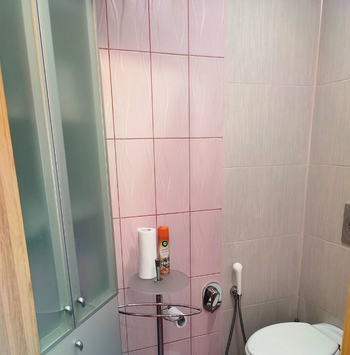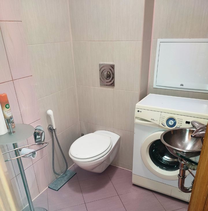 В малом санузле унитаз с гигиеническим душем, раковина - современная сантехника радует глаз. Новая стиральная машина, вместительный шкаф для хозяйственных принадлежностей.