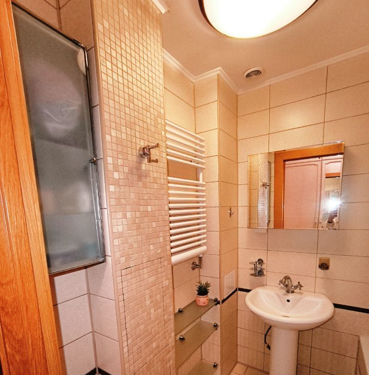 В большом санузле царство чистоты и функциональности: ванна 180 см, раковина, водонагреватель, навесная полка.