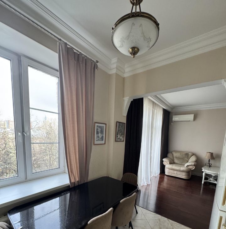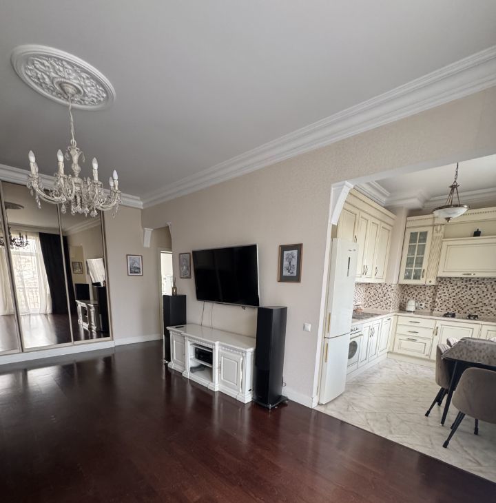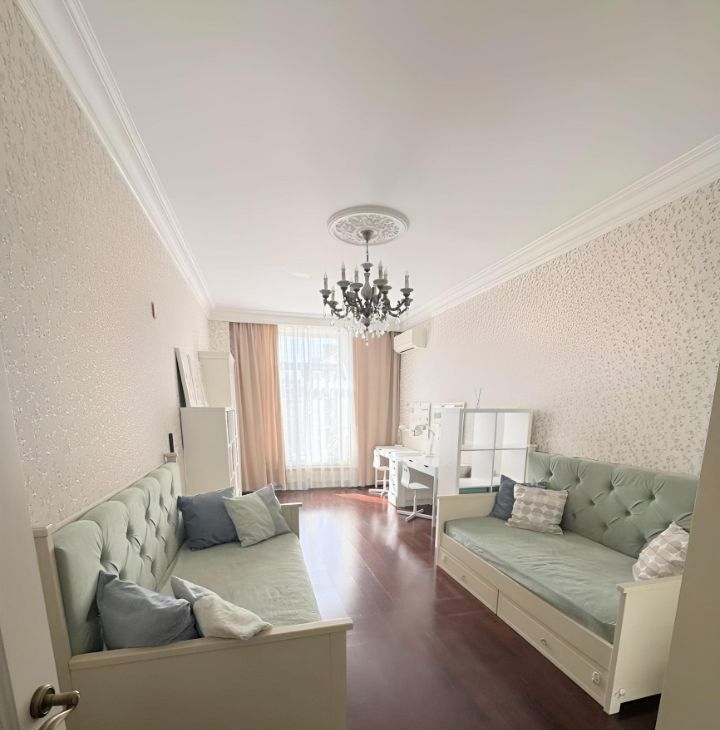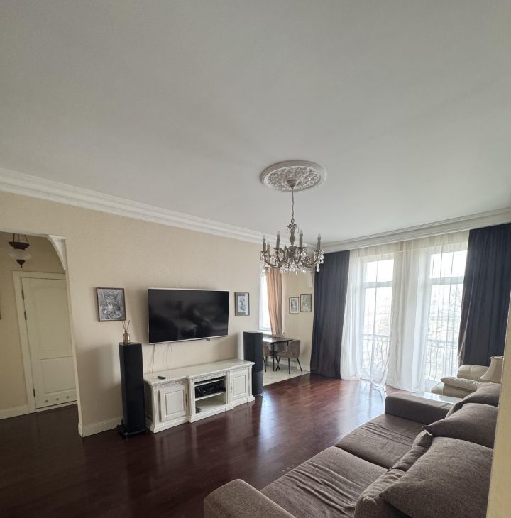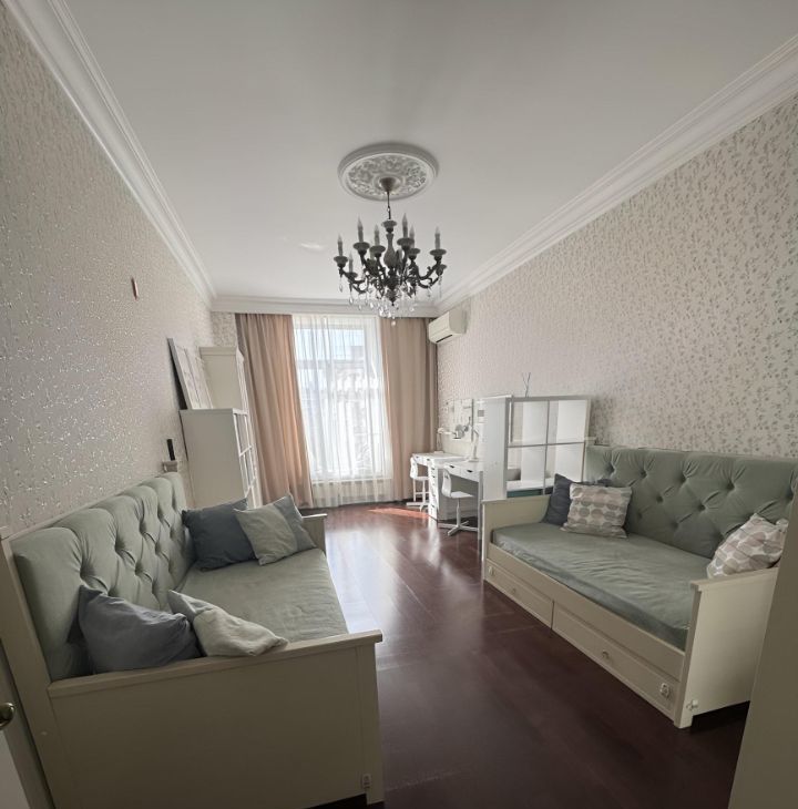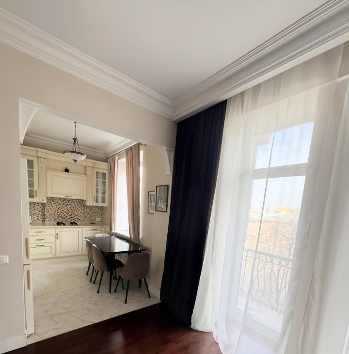 Общая площадь квартиры составляет 87,6 кв. м, жилая — 38 кв. м, а кухня впечатляет своими 26 кв. м. Квартира расположена на 6 этаже 9-этажного дома, высота потолков — 3.2 метра.