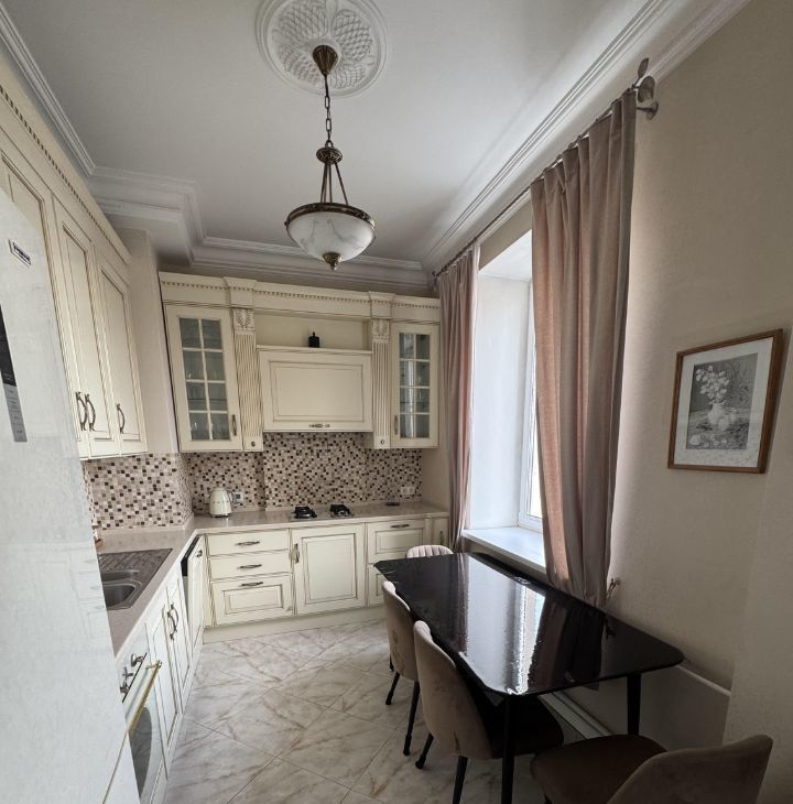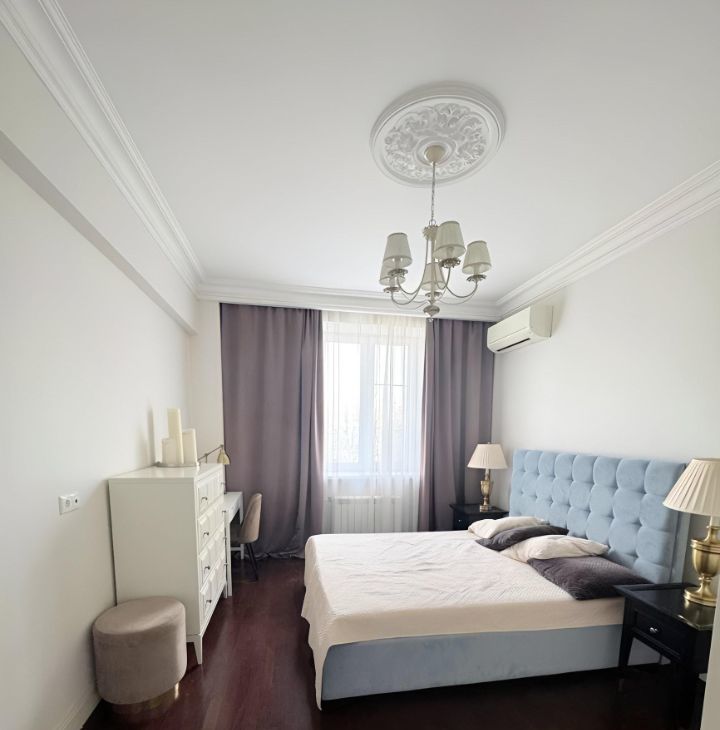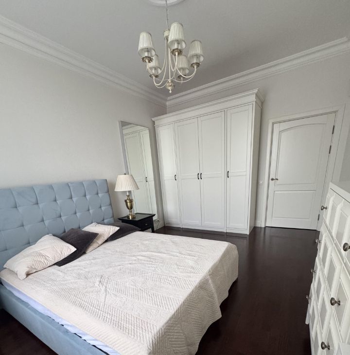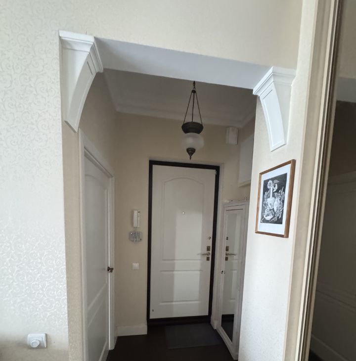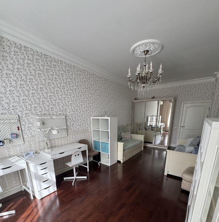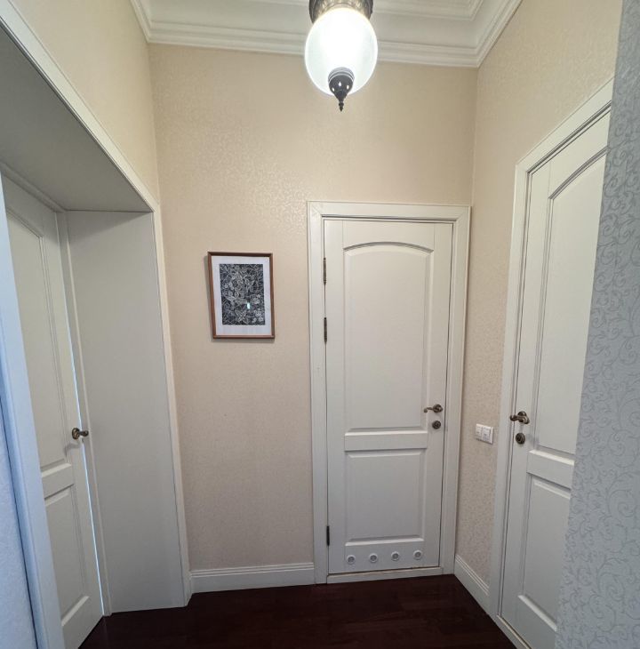 Общая площадь квартиры составляет 87,6 кв. м, жилая — 38 кв. м, а кухня впечатляет своими 26 кв. м. Квартира расположена на 6 этаже 9-этажного дома, высота потолков — 3.2 метра.